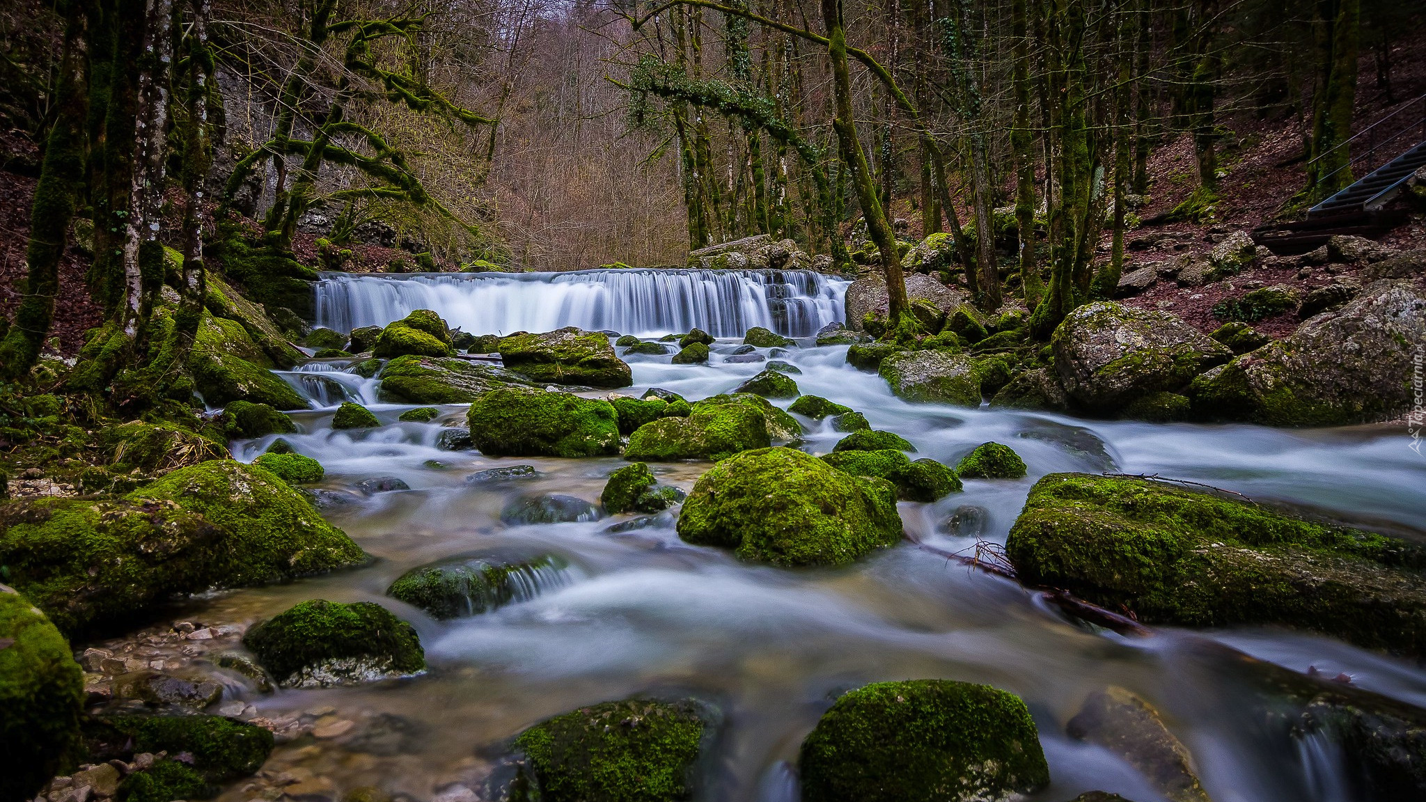 Edytor tapety: Omszałe kamienie i próg rzeczny na rzece leśnej