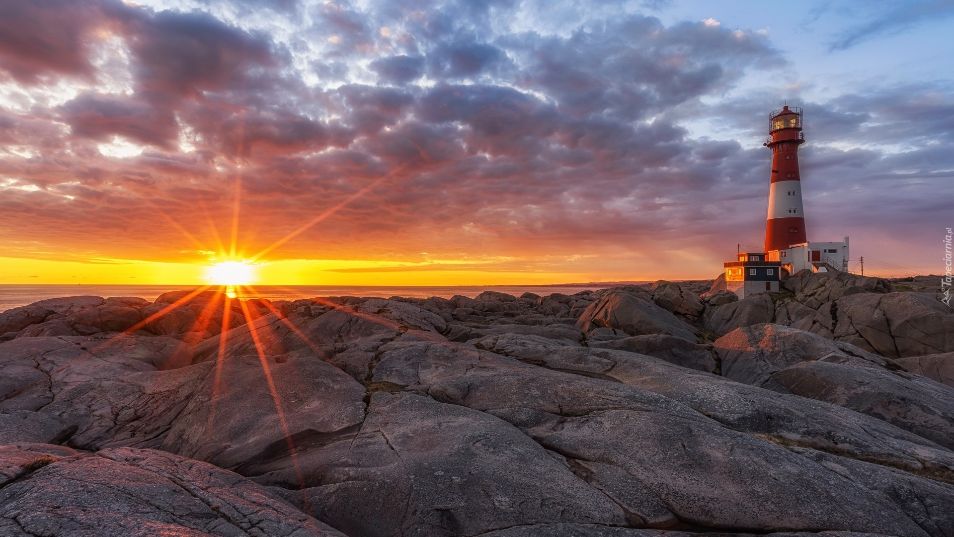 Edytor tapety: Latarnia morska na skałach w promieniach zachodzącego słońca