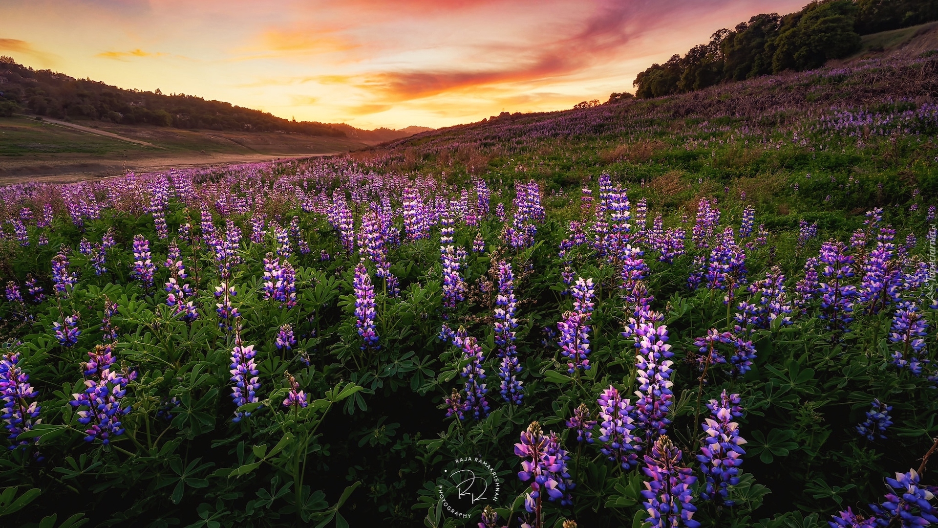 Edytor tapety: Łubinowa łąka na wzgórzu