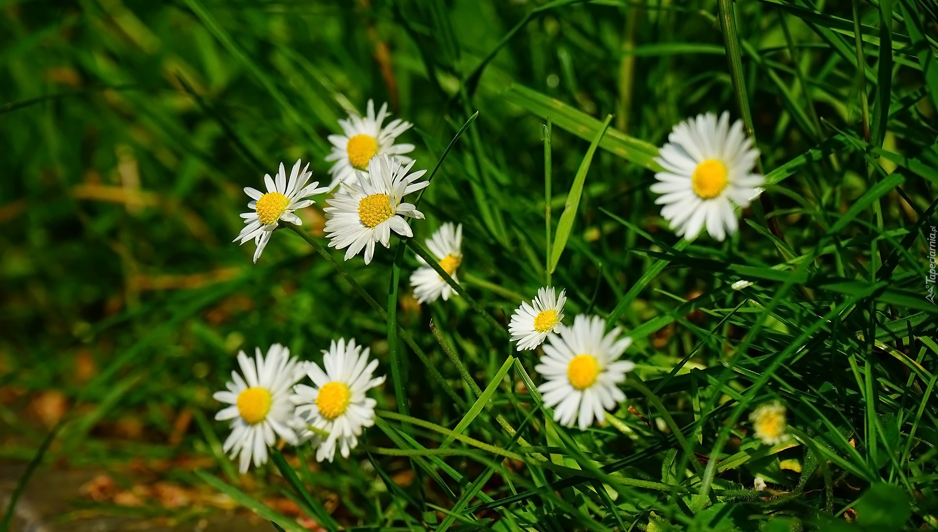 Edytor tapety: Pochylone stokrotki w trawie