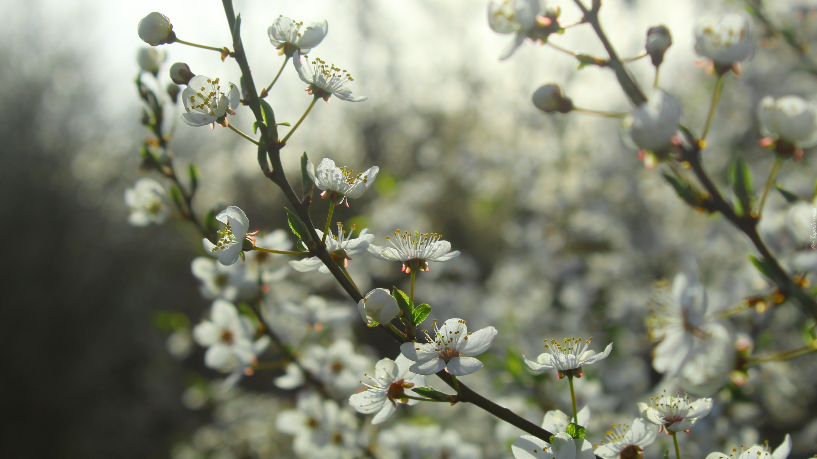Edytor tapety: Kwitnące białymi kwiatami drzewo owocowe