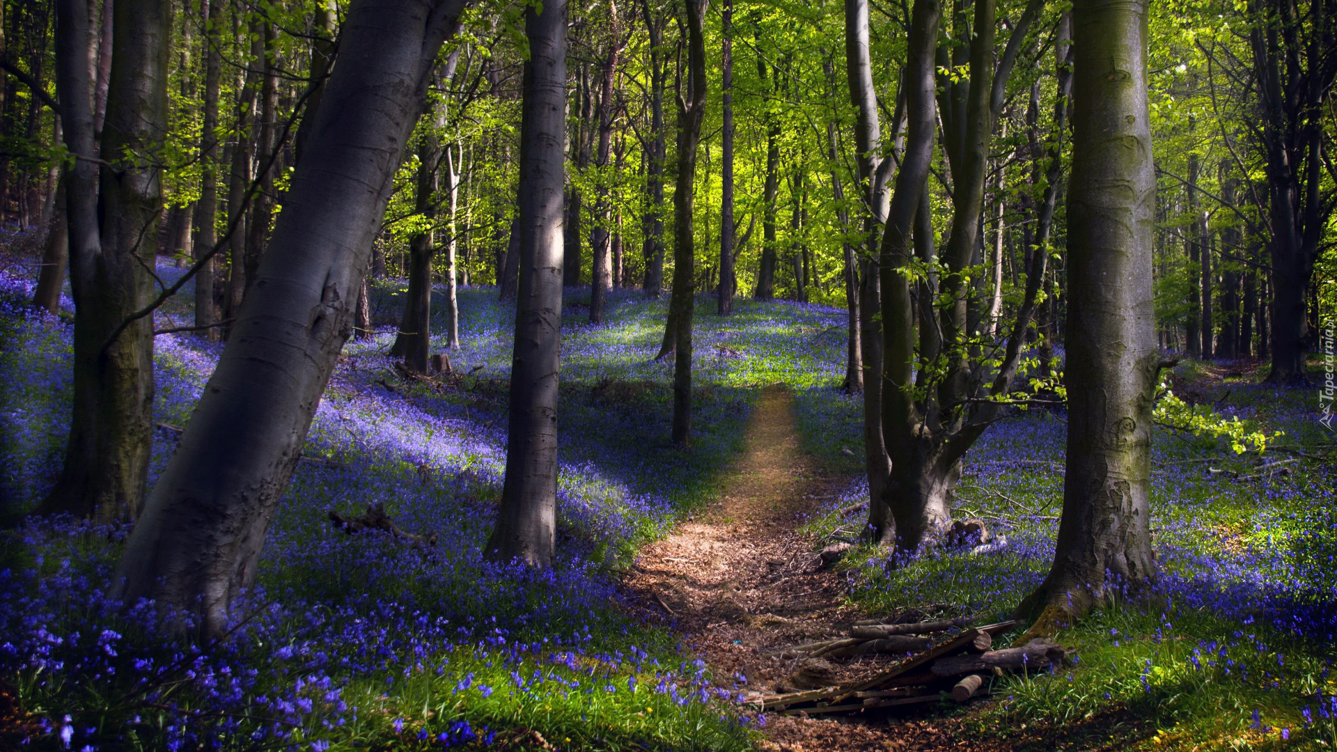 Edytor tapety: Niebieskie kwiaty pod drzewami przy leśnej ścieżce
