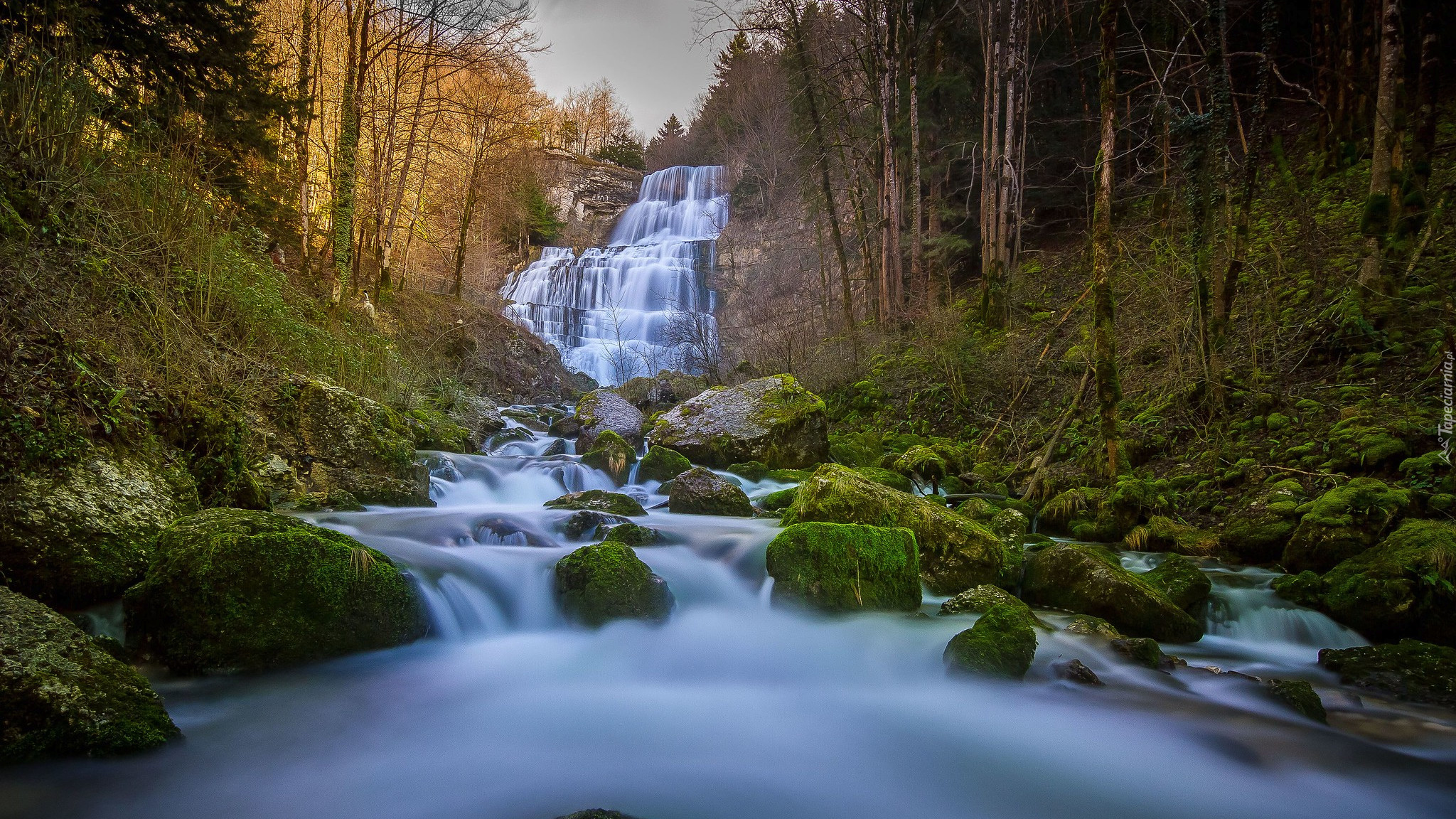 Edytor tapety: Kamienie w leśnej rzece i wodospad na skale