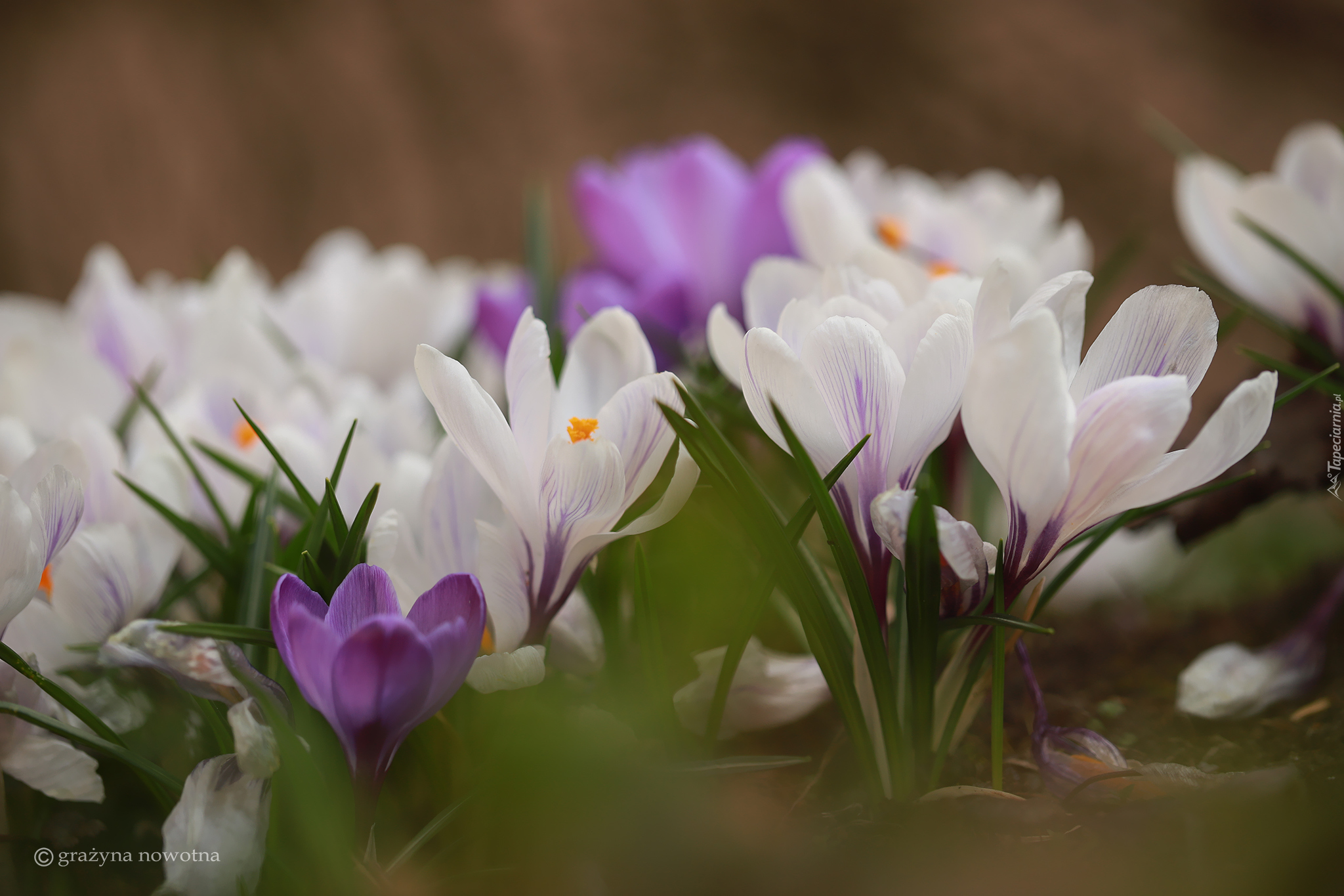 Edytor tapety: Kępki białych i fioletowych krokusów