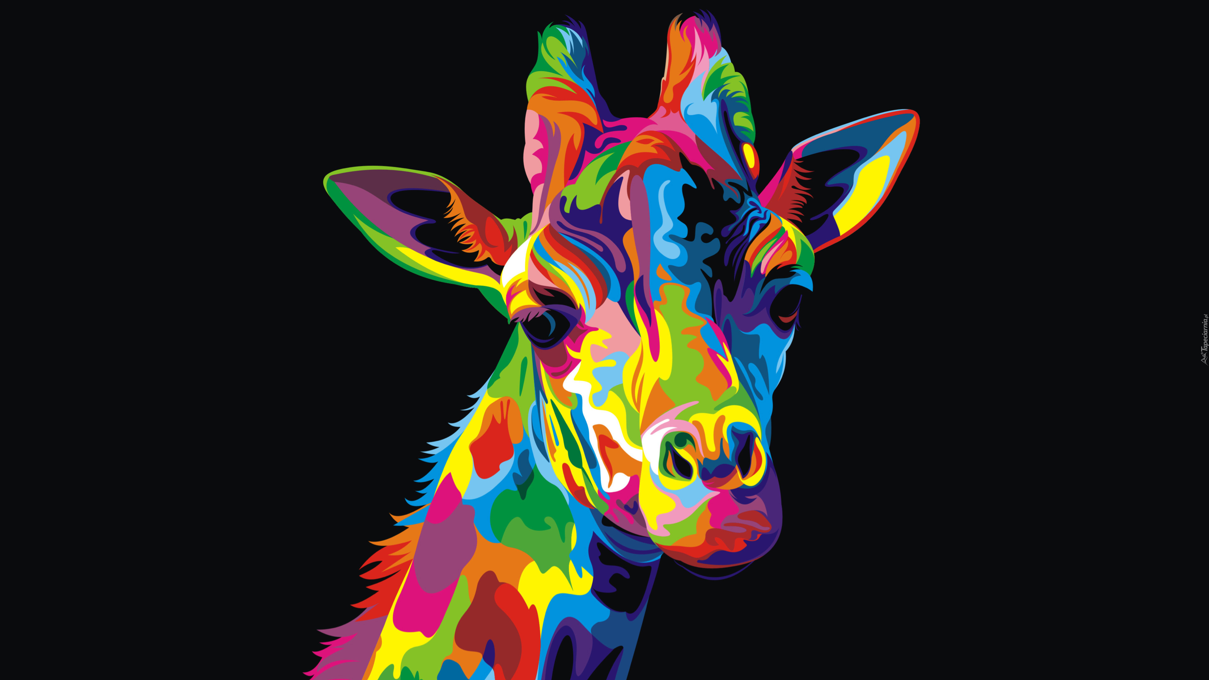 Edytor tapety: Kolorowa głowa żyrafy w grafice na czarnym tle