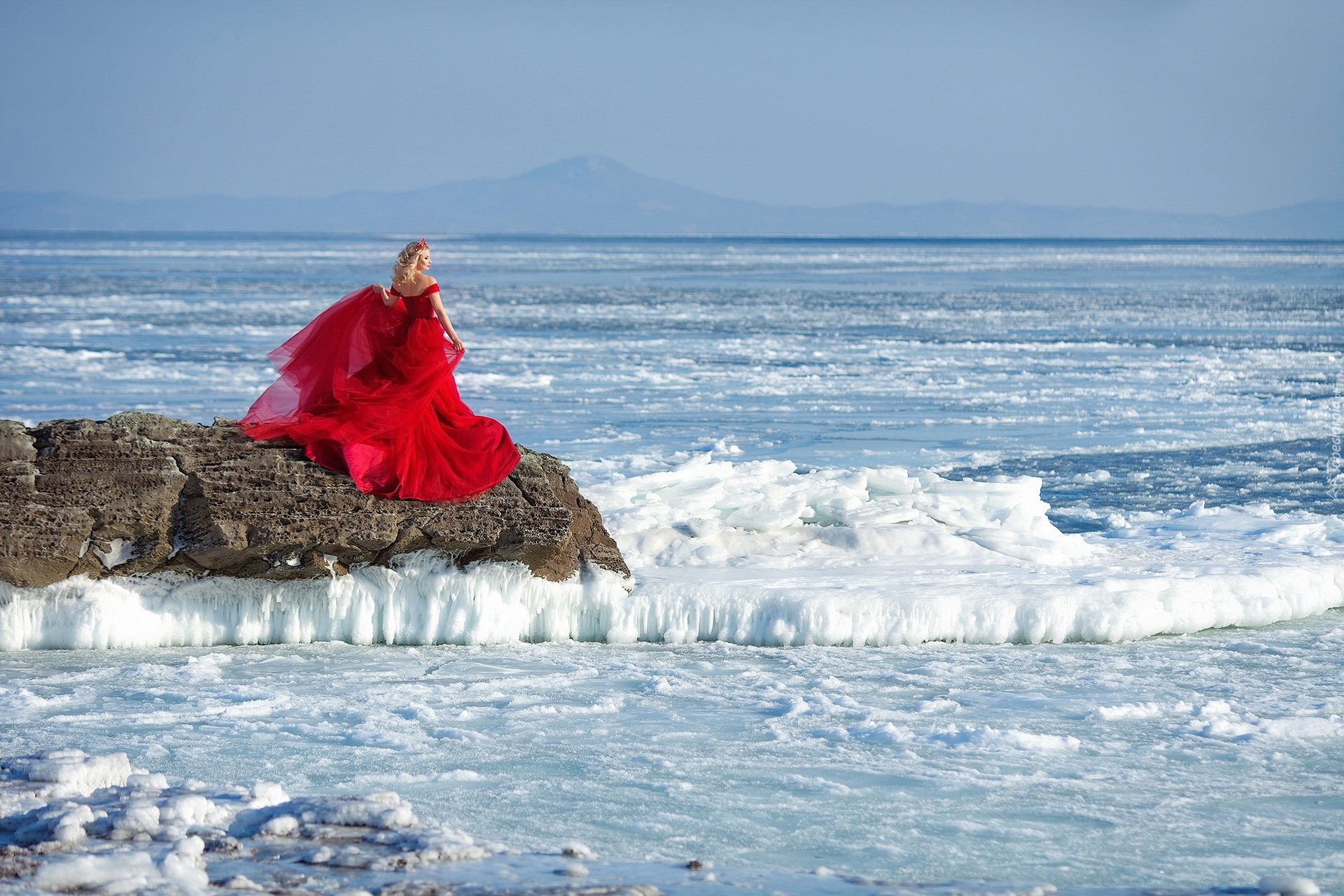 Edytor tapety: Kobieta w czerwonej sukni na skale