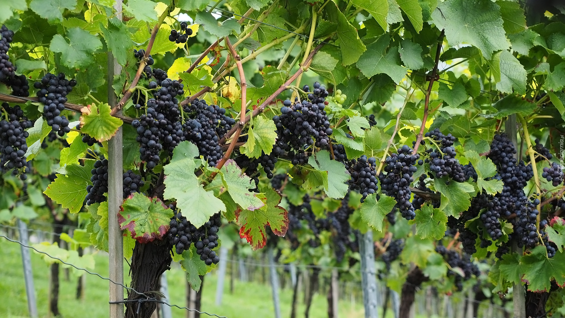 Edytor tapety: Kiście ciemnych winogron z liśćmi