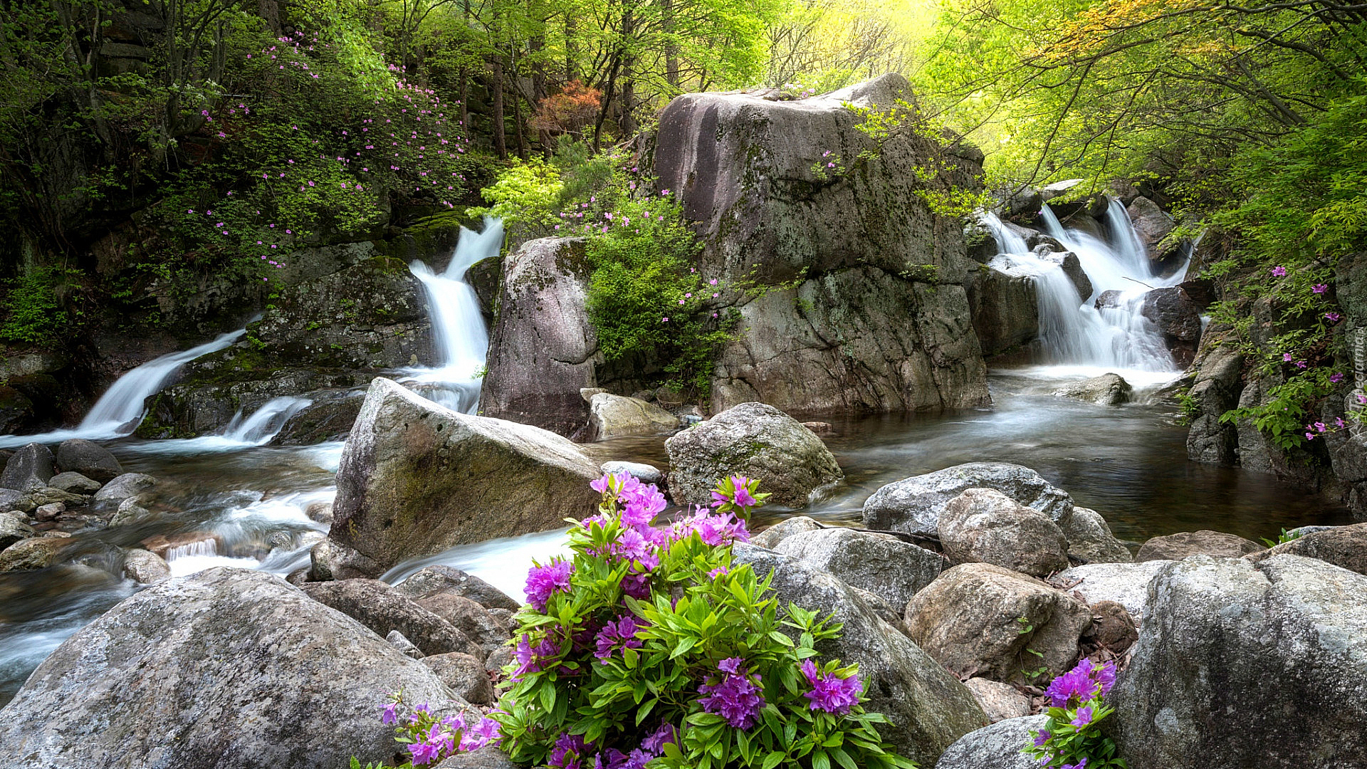 Edytor tapety: Rododendrony na skałach przy leśnym strumieniu