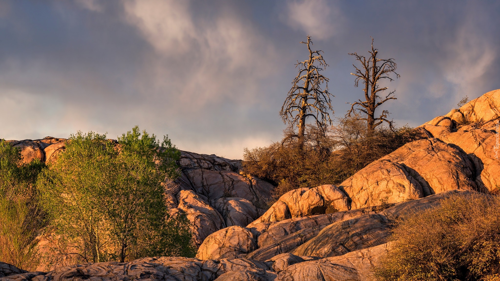Edytor tapety: Drzewa na skałach w słonecznym blasku