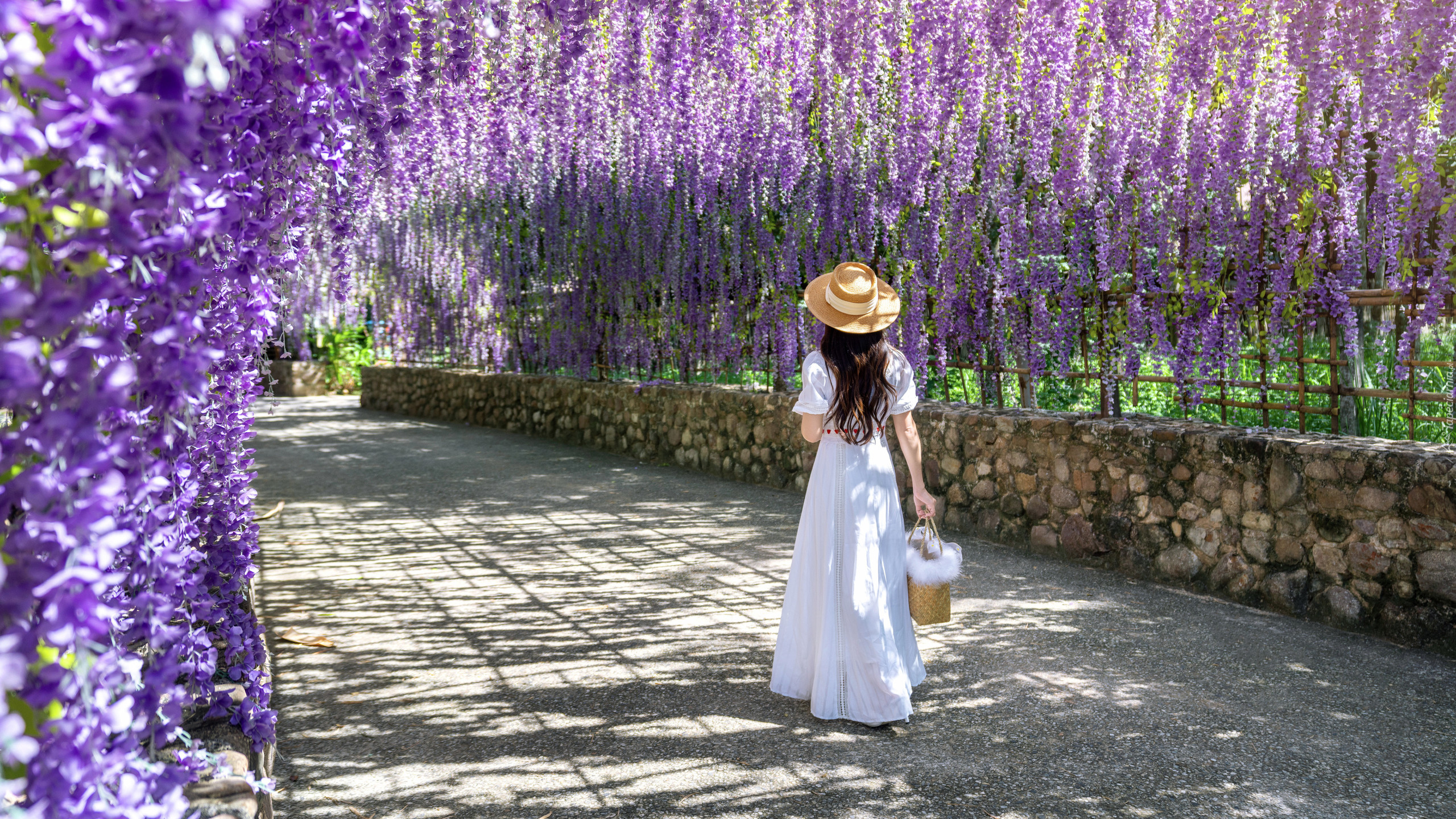 Edytor tapety: Kobieta pod kwiatami glicynii