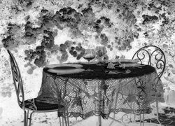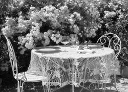 Edytor tapety: Stół i krzesła pod krzewami róż w ogrodzie