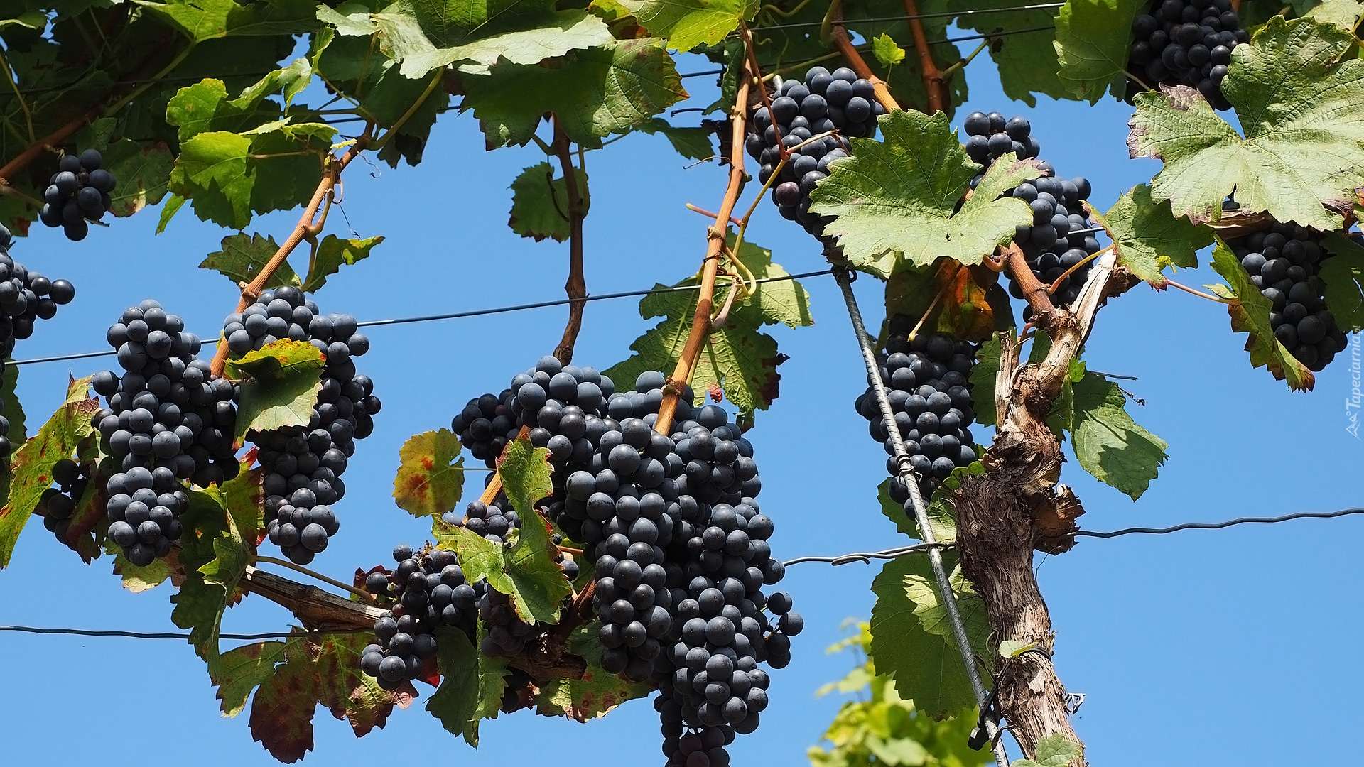Edytor tapety: Kiście ciemnych winogron z listkami