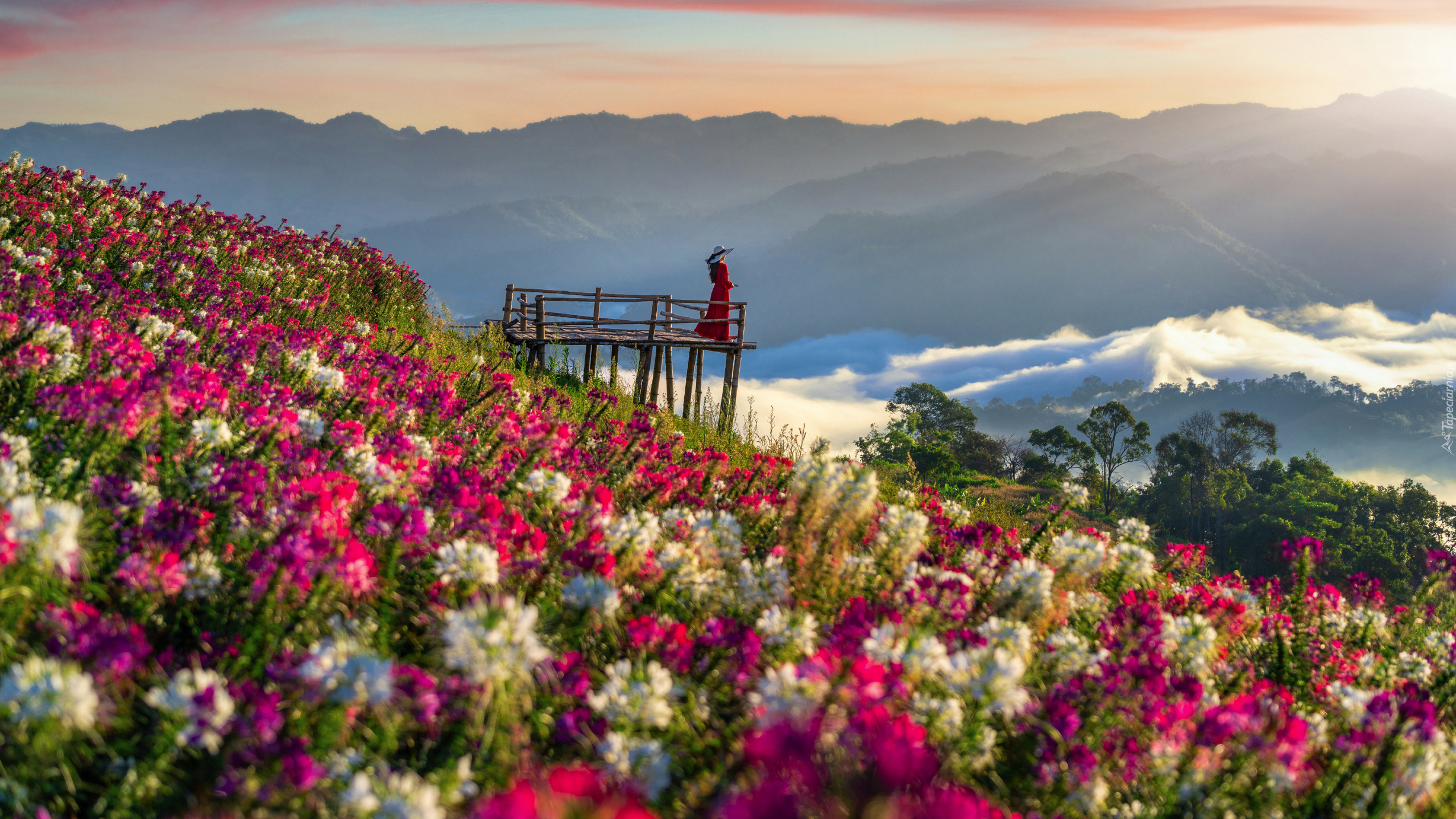Edytor tapety: Dziewczyna w czerwonej sukience na pomoście widokowym