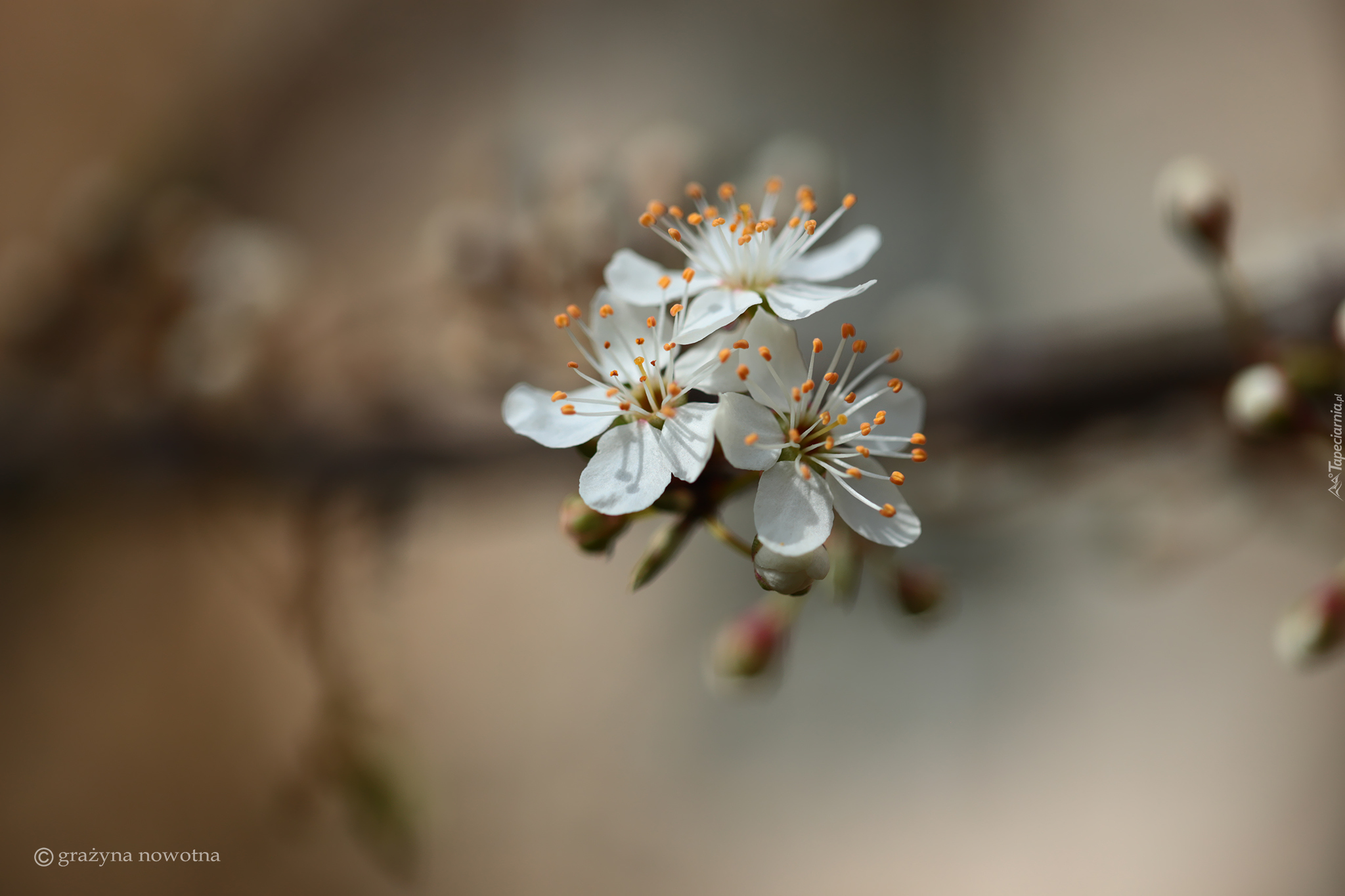 Edytor tapety: Białe kwiaty i pąki drzewa owocowego w zbliżeniu