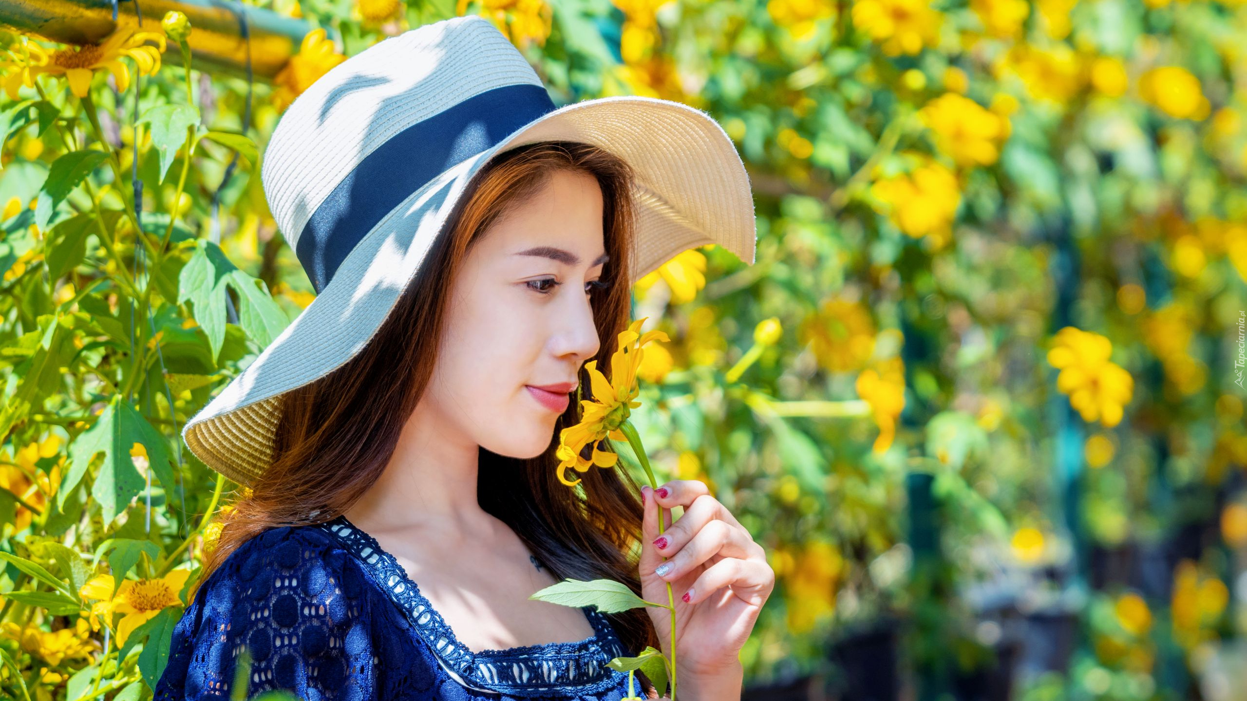 Edytor tapety: Azjatka w kapeluszu z żółtym kwiatem