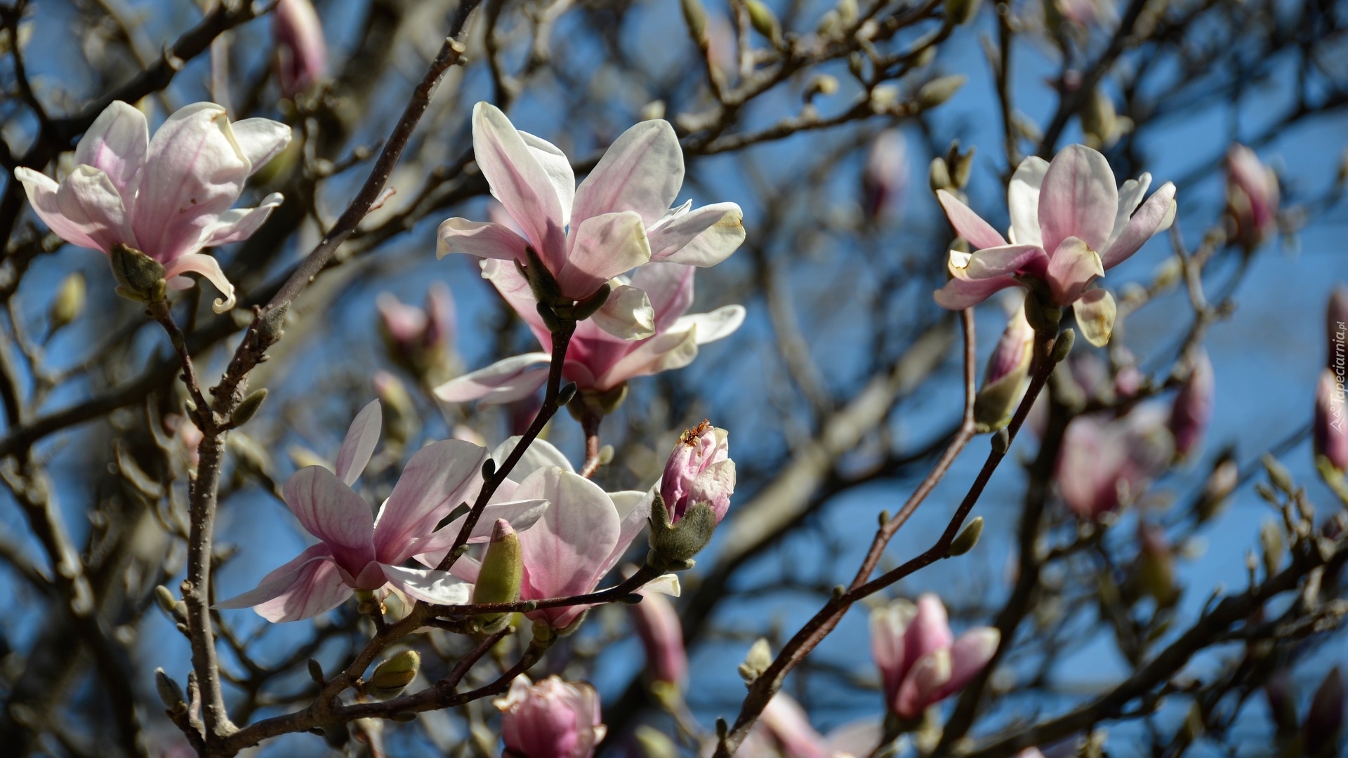 Edytor tapety: Gałązki kwitnącej magnolii na tle nieba