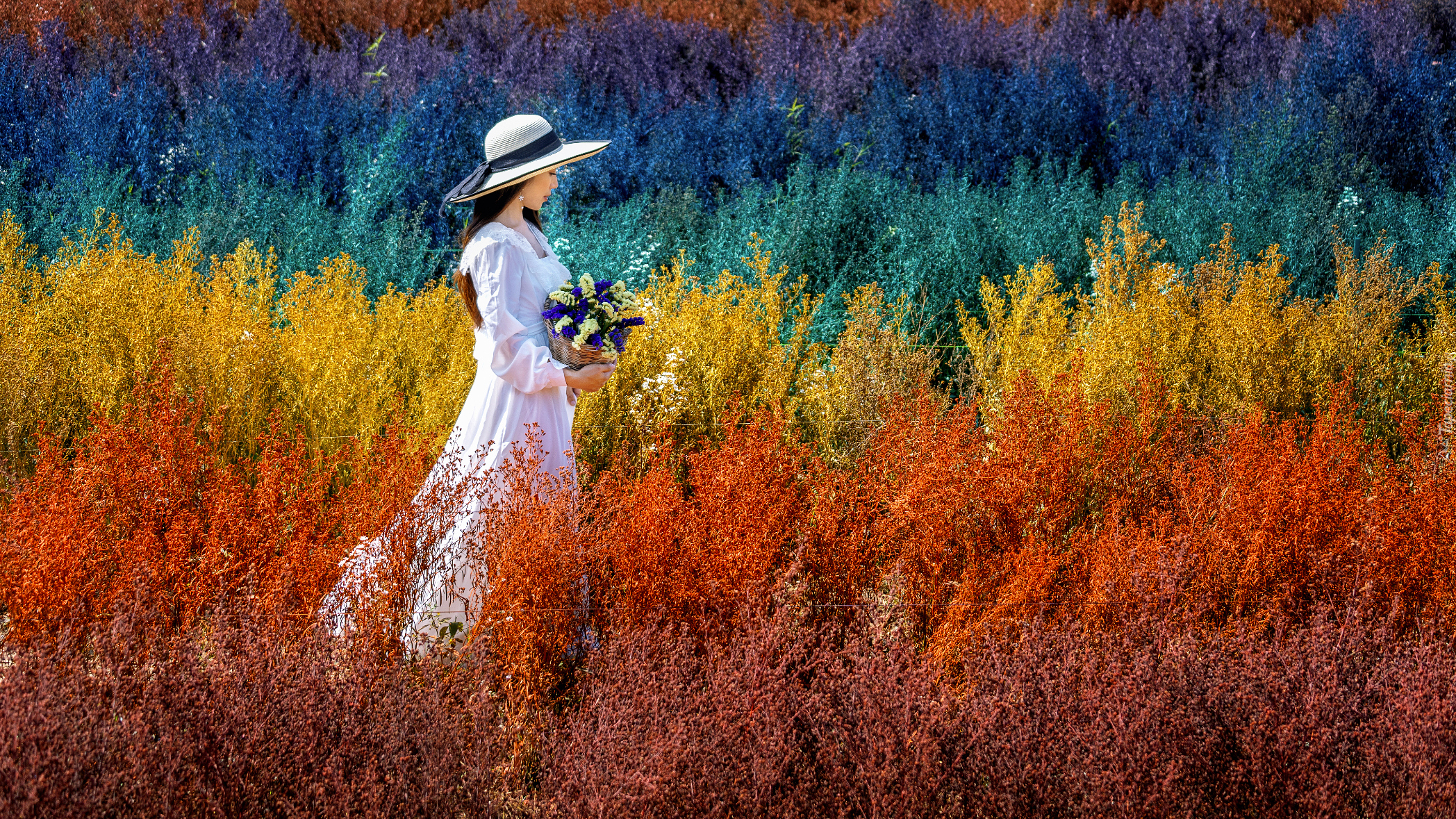 Edytor tapety: Kobieta pośród kolorowych roślin