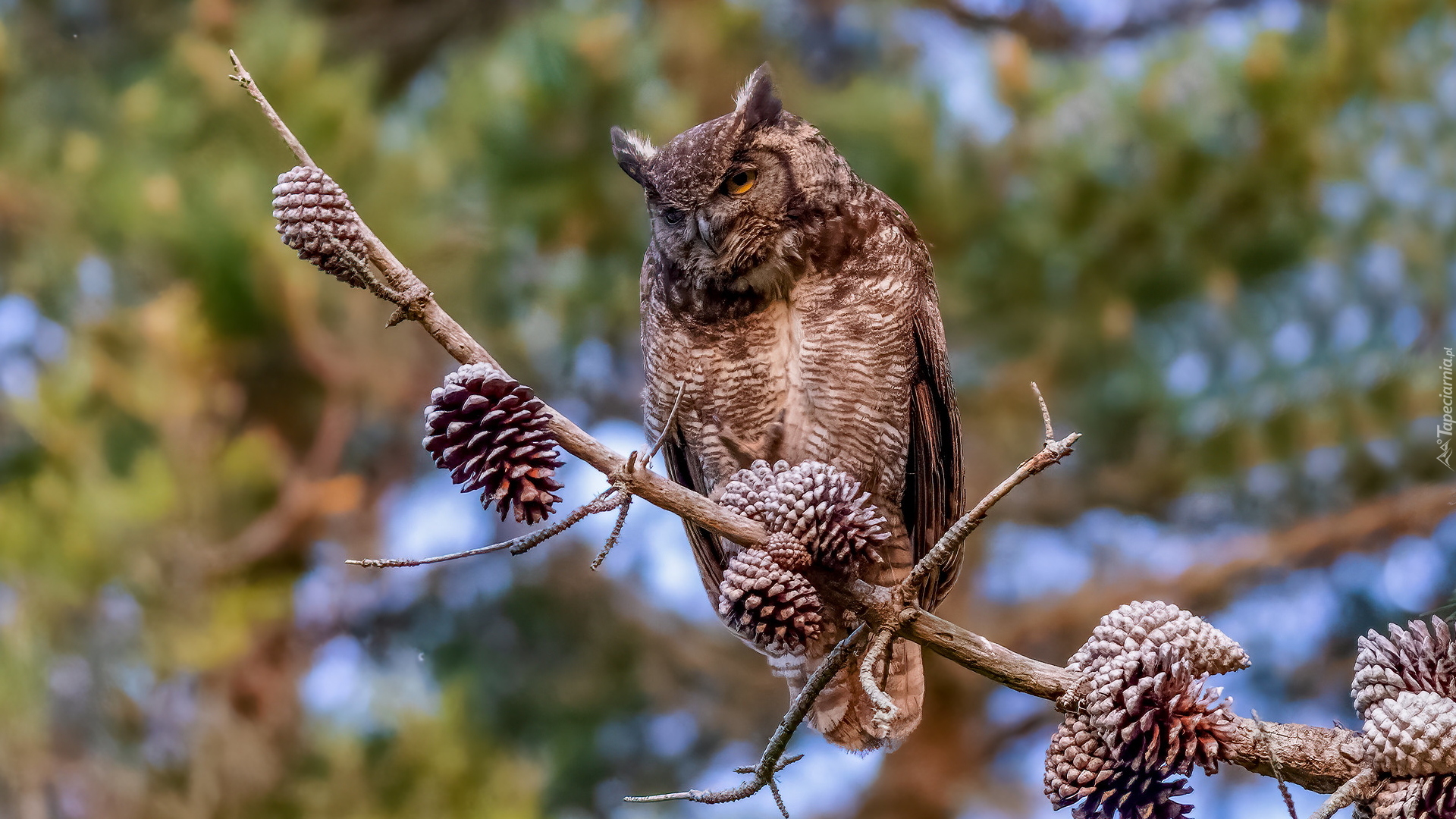 Edytor tapety: Puchacz wirginijski na gałązce z szyszkami