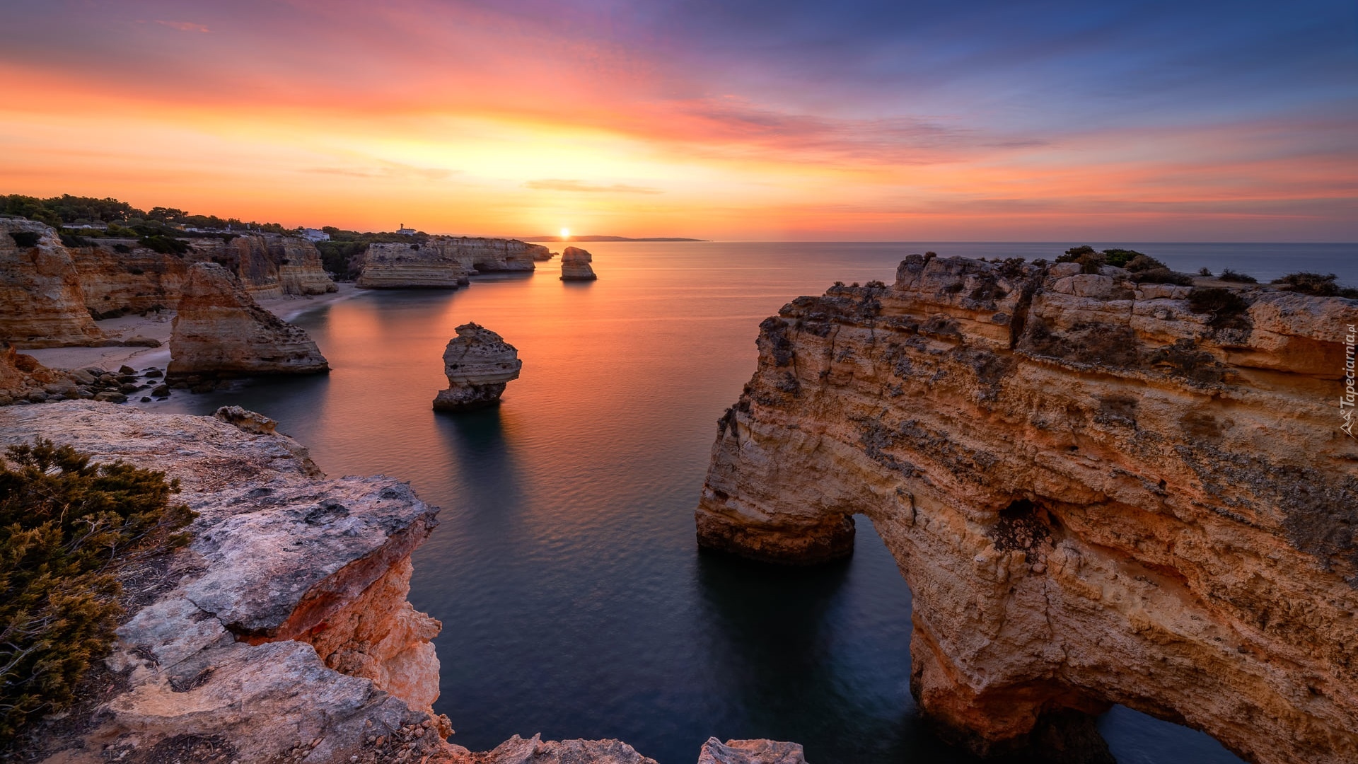 Edytor tapety: Wschód słońca nad skalistym morskim wybrzeżem