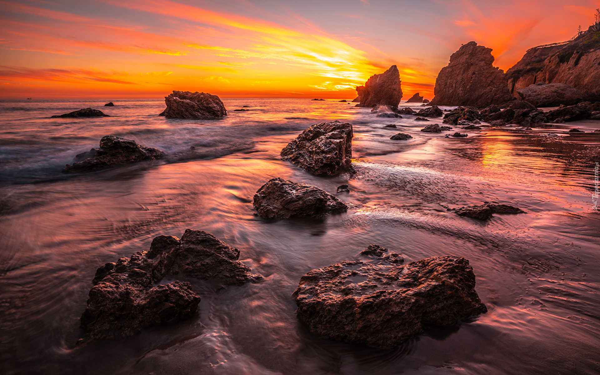 Edytor tapety: Skały na brzegu morza i kolorowy zachód słońca