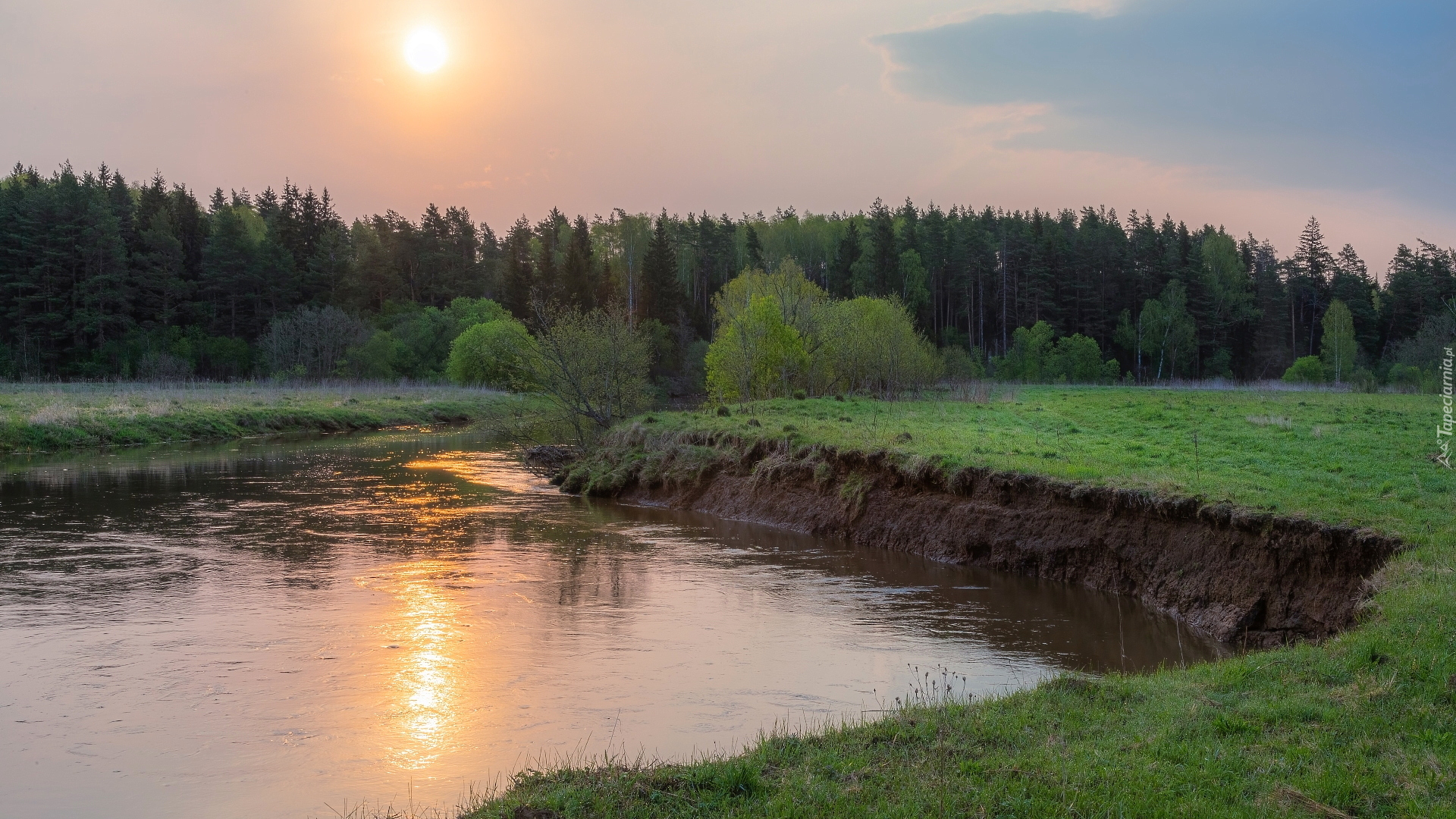 Edytor tapety: Zachodzące słońce nad rzeką i lasem