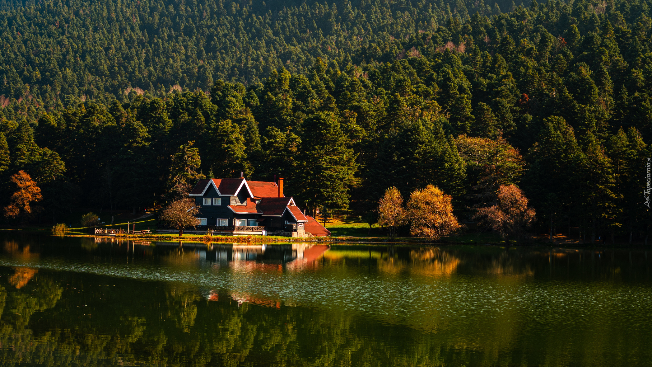 Edytor tapety: Domy pod lasem nad jeziorem Golcuk w Turcji