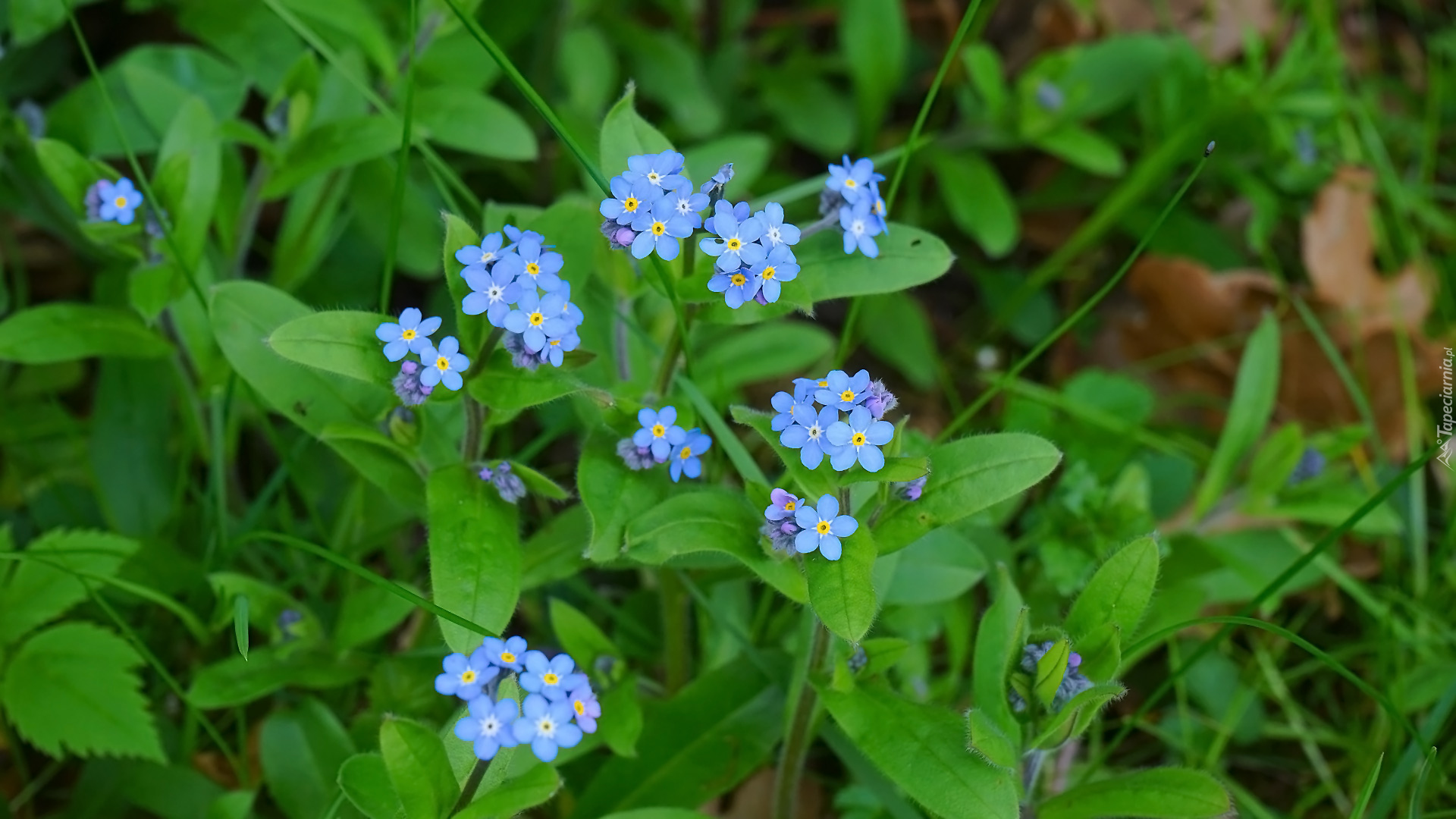 Edytor tapety: Niezapominajki z zielonymi listkami