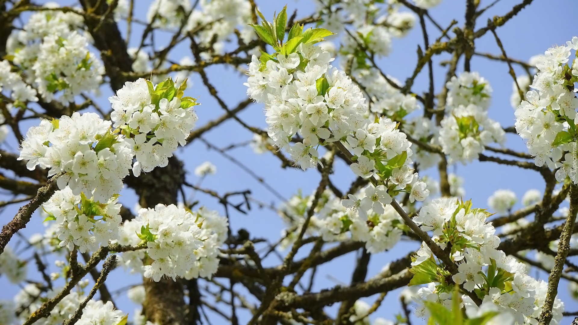 Edytor tapety: Kwitnące na biało drzewo owocowe na tle nieba