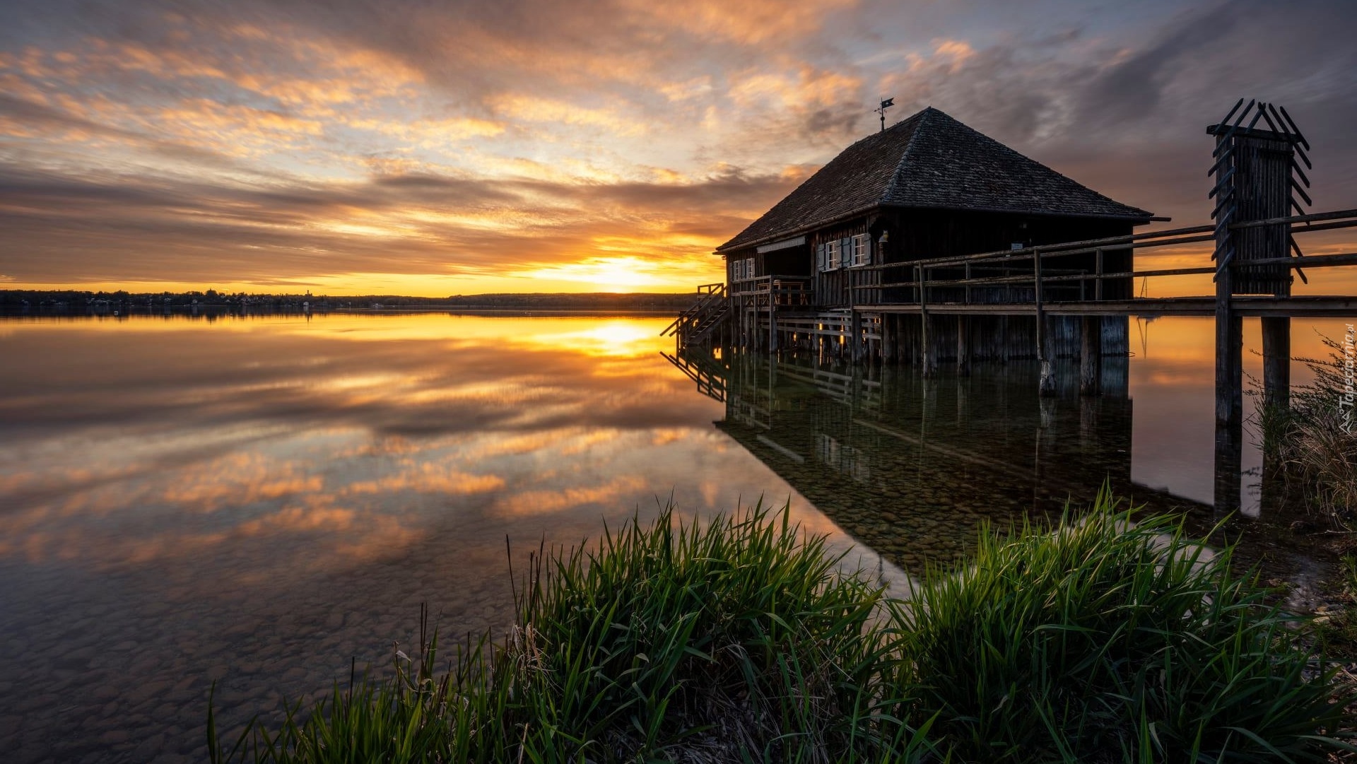 Edytor tapety: Dom z pomostem nad jeziorem