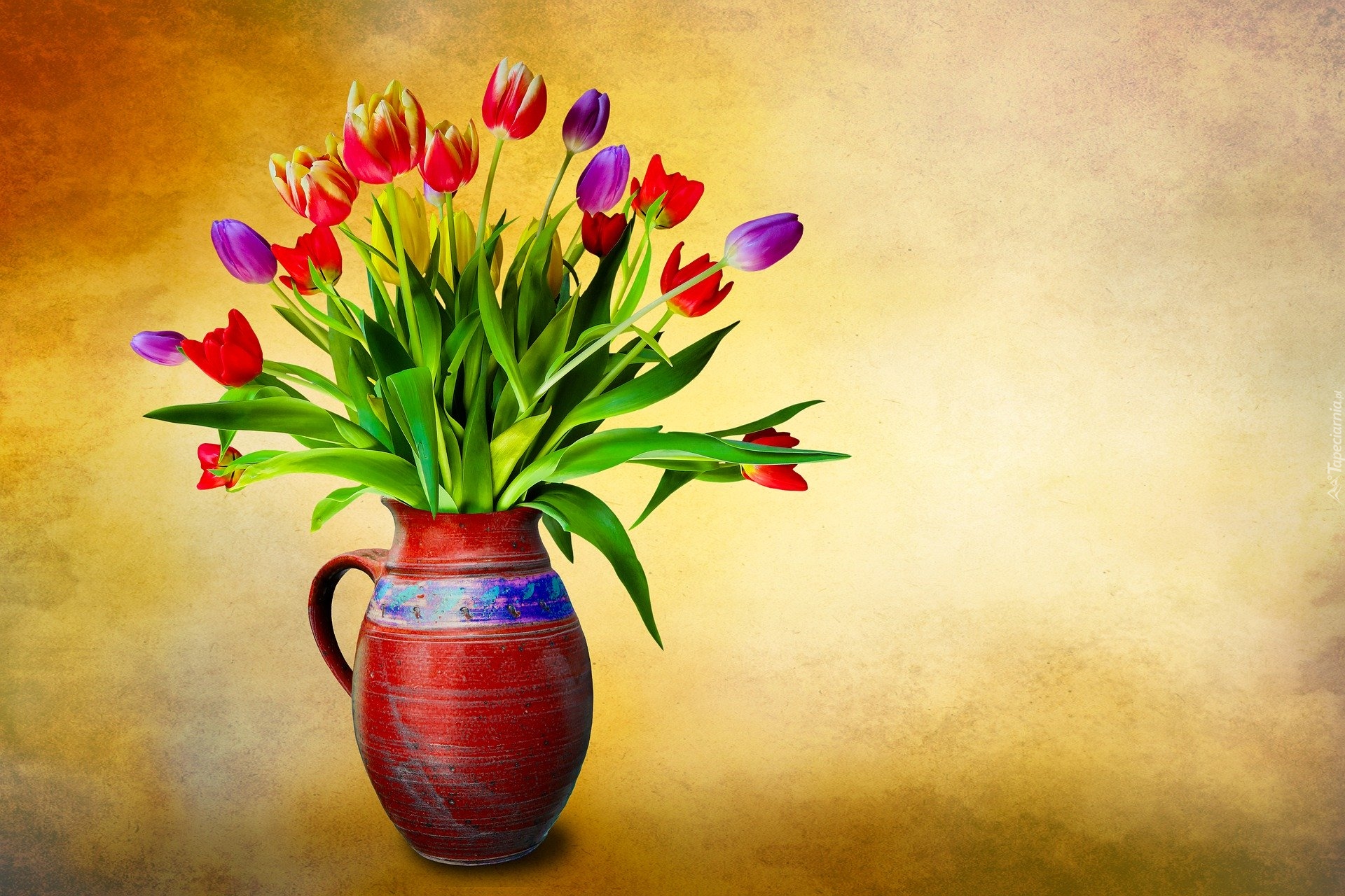 Edytor tapety: Bukiet kolorowych tulipanów w dzbanku