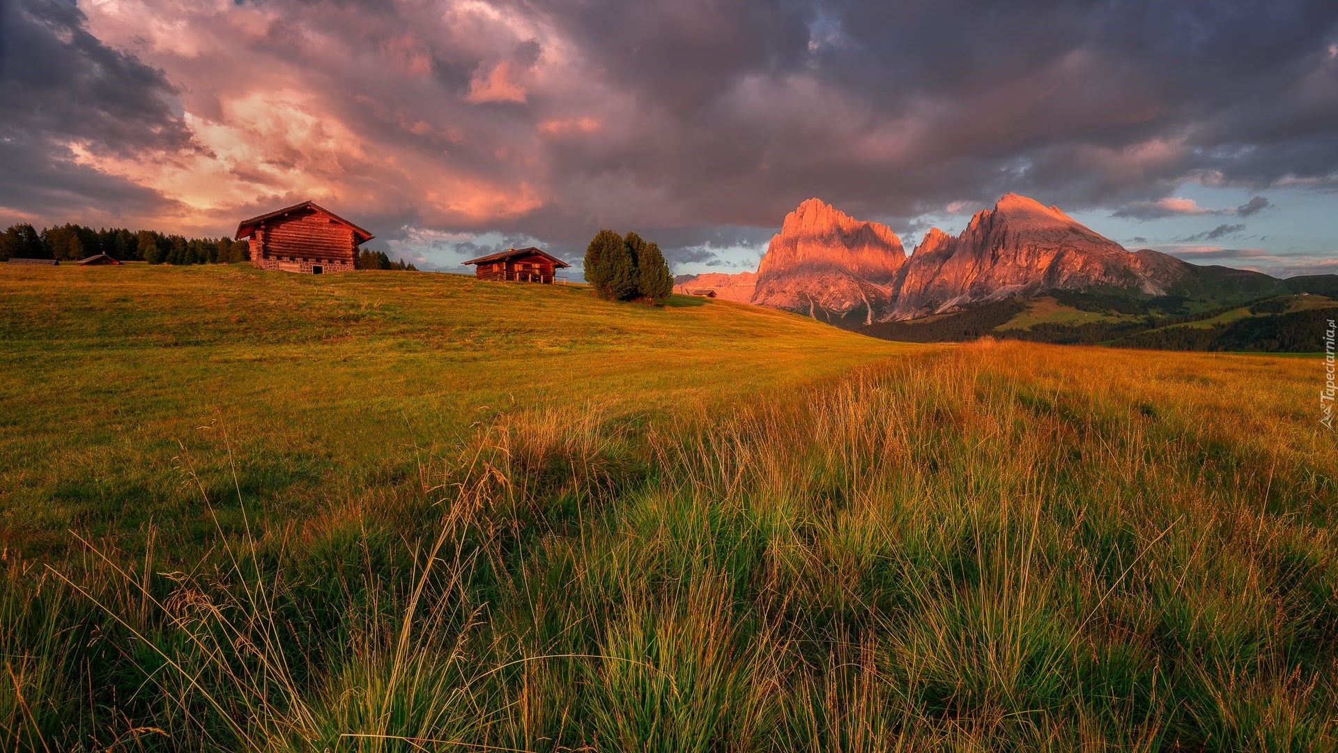 Edytor tapety: Domki na łące i Dolomity w oddali