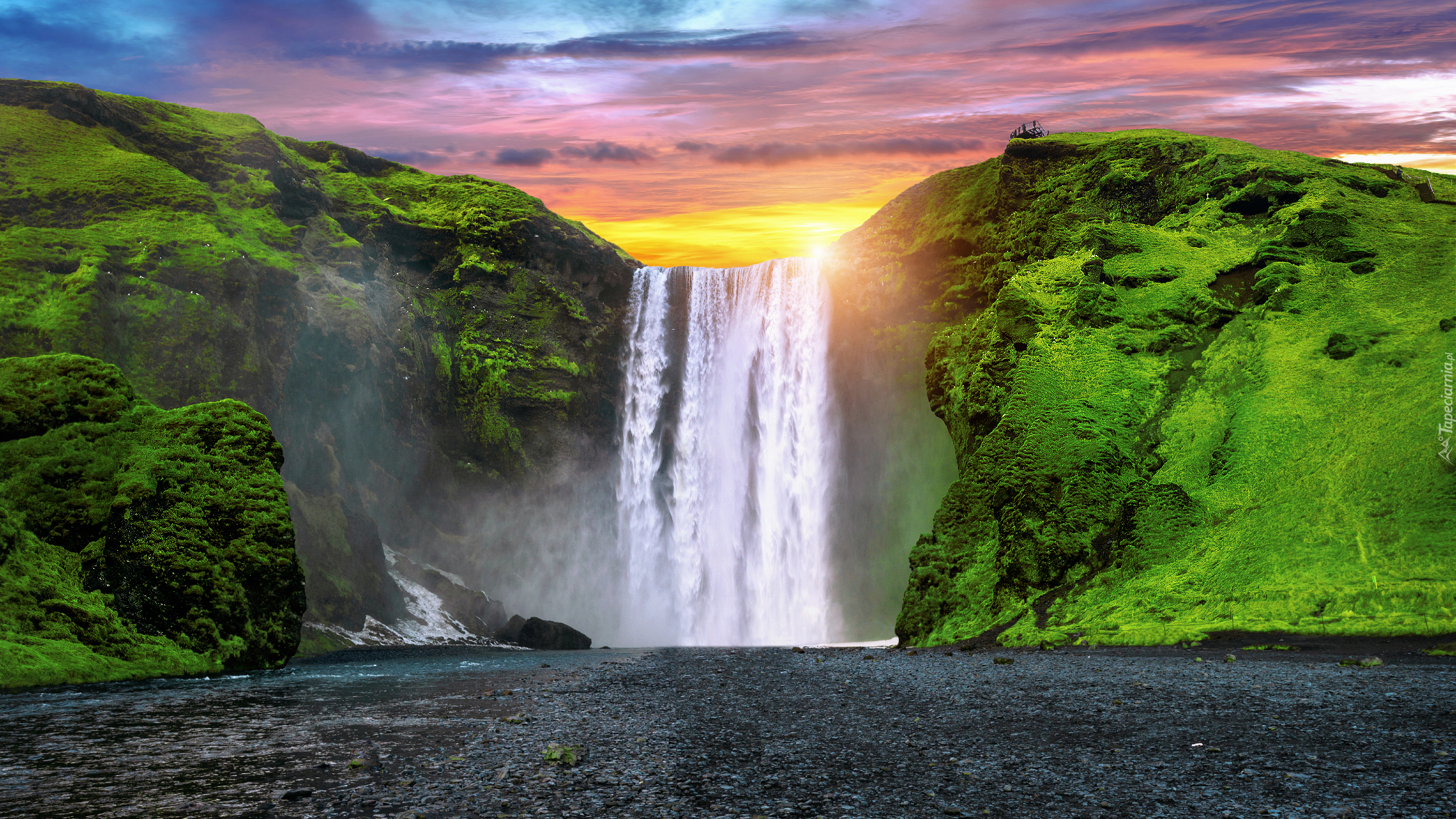 Edytor tapety: Zielone wzgórza i wodospad Skogafoss
