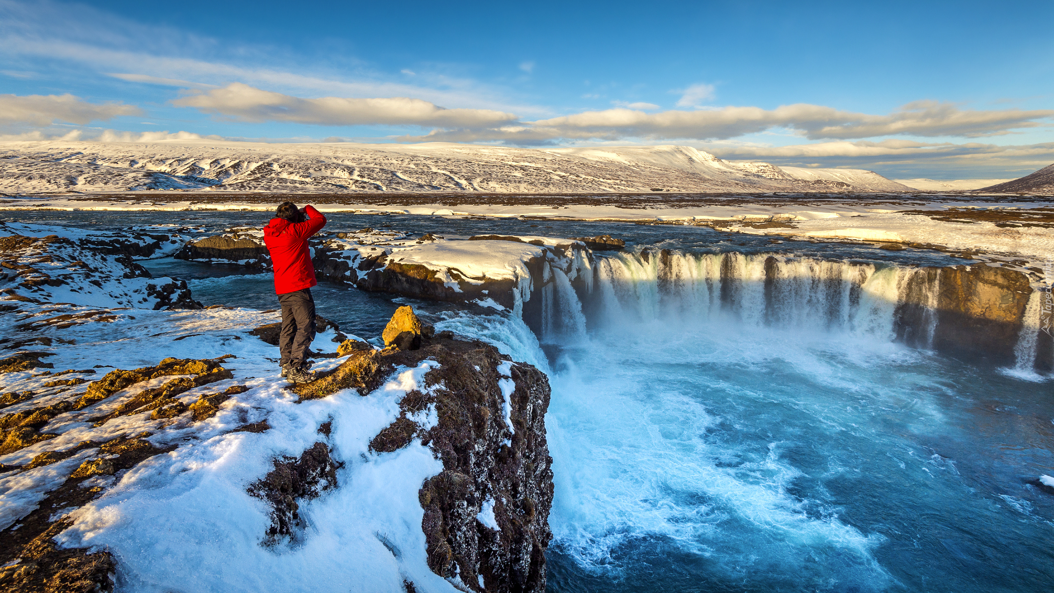 Edytor tapety: Mężczyzna fotografujący wodospad Godafoss