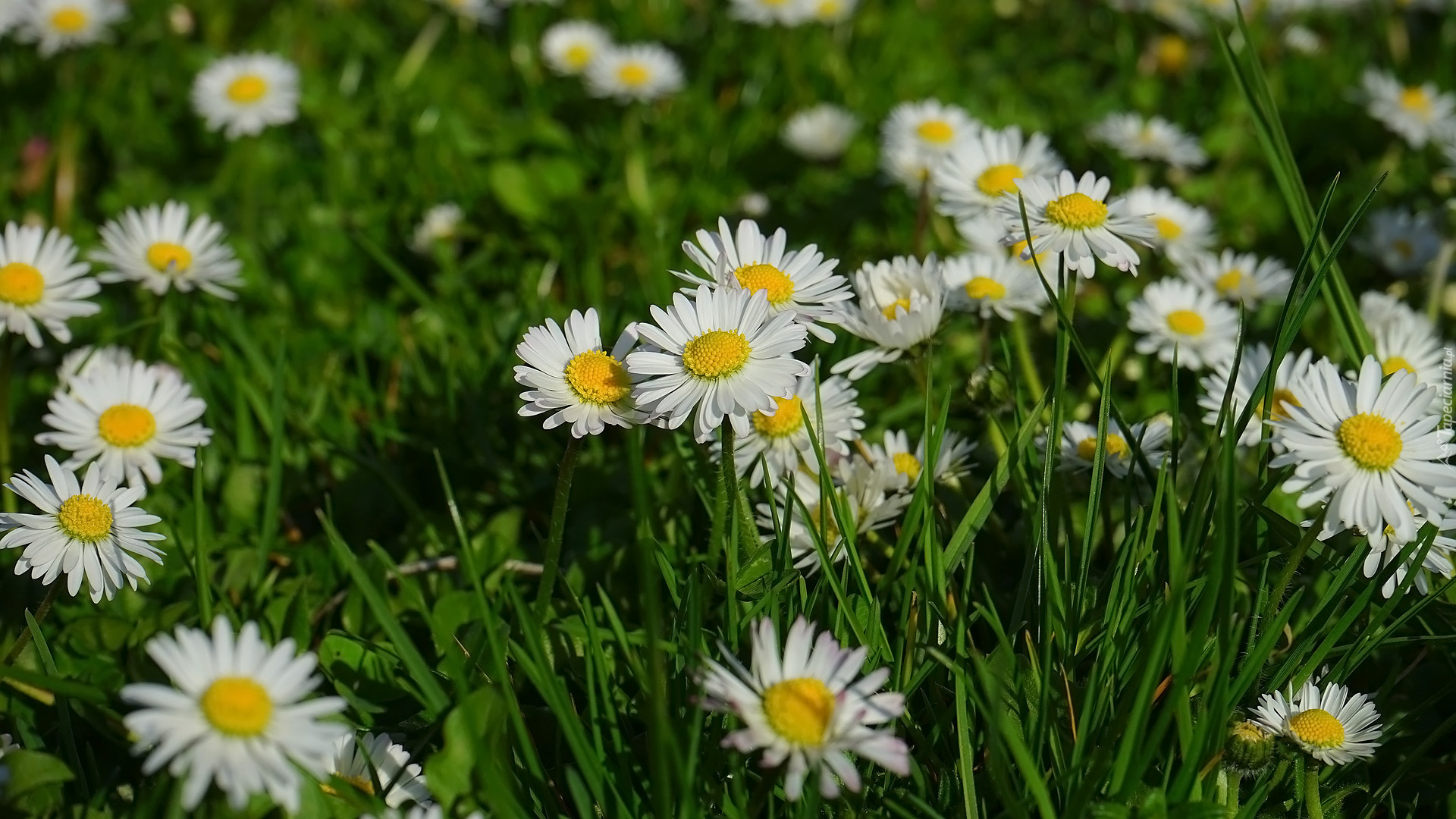 Edytor tapety: Rozświetlone białe stokrotki w trawie