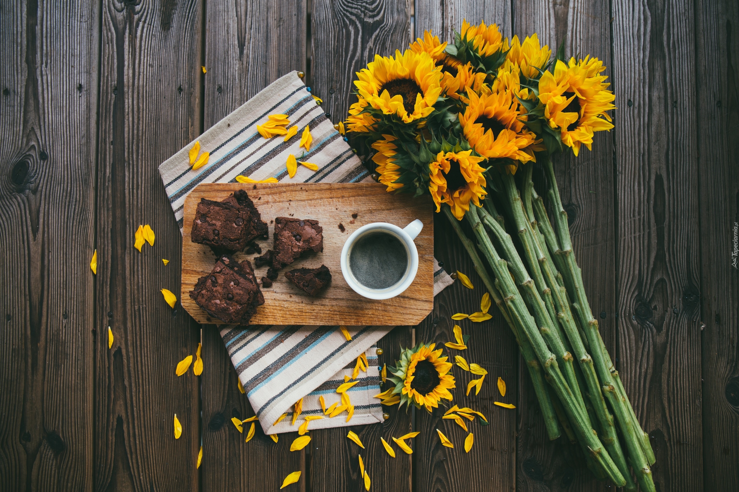 Edytor tapety: Słoneczniki obok kawy i ciasta