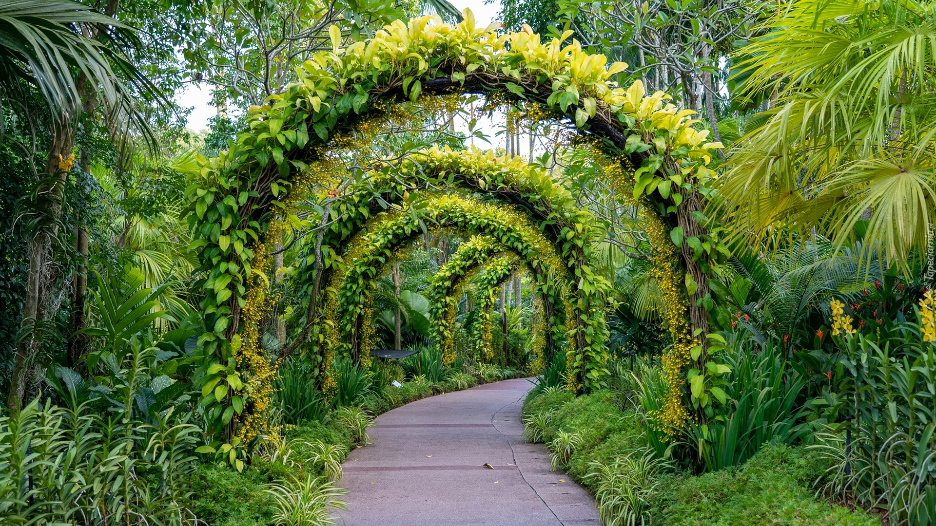 Edytor tapety: Ścieżka pod łukami z roślin w parku