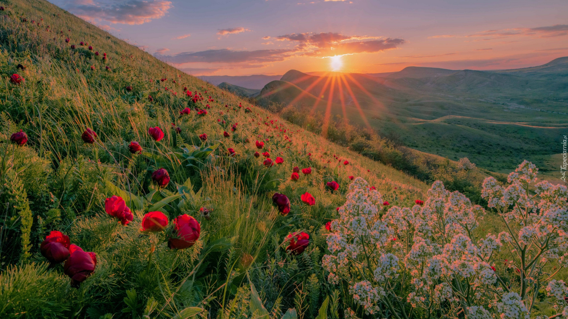 Edytor tapety: Piwonie na łące i widok na góry
