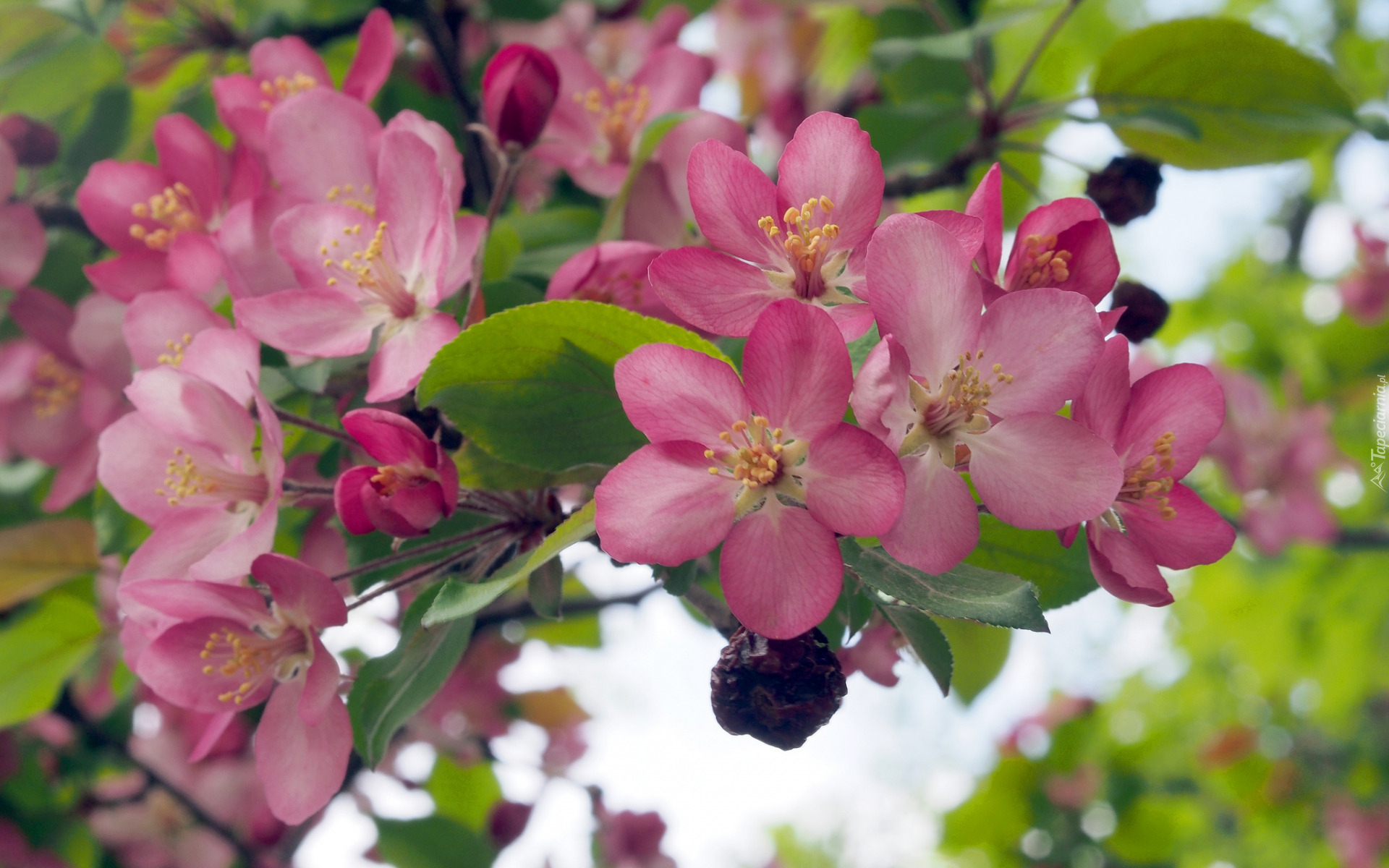 Edytor tapety: Okwiecona różowymi kwiatami gałązka jabłoni