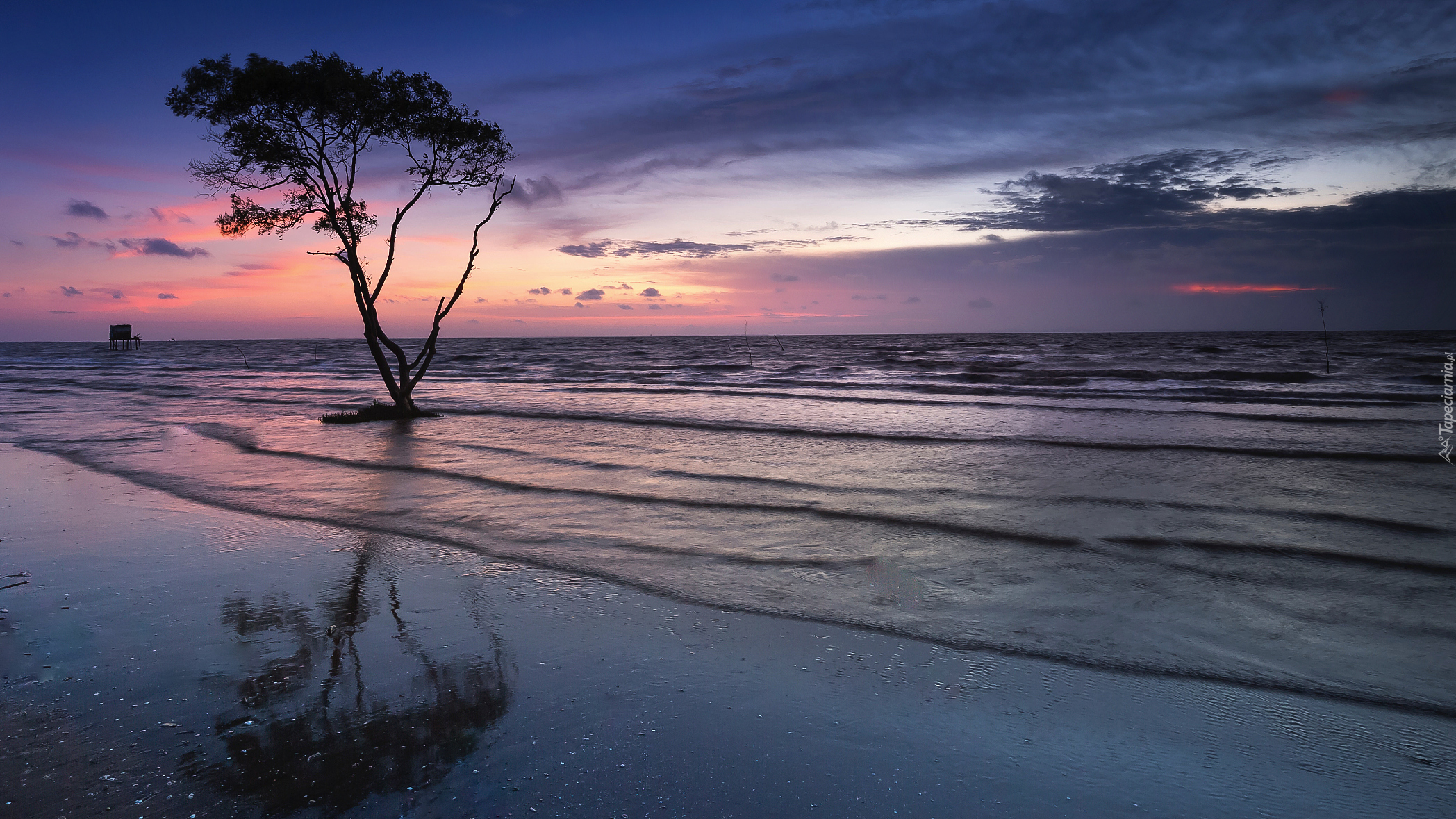 Edytor tapety: Drzewo na morskiej plaży o zmierzchu