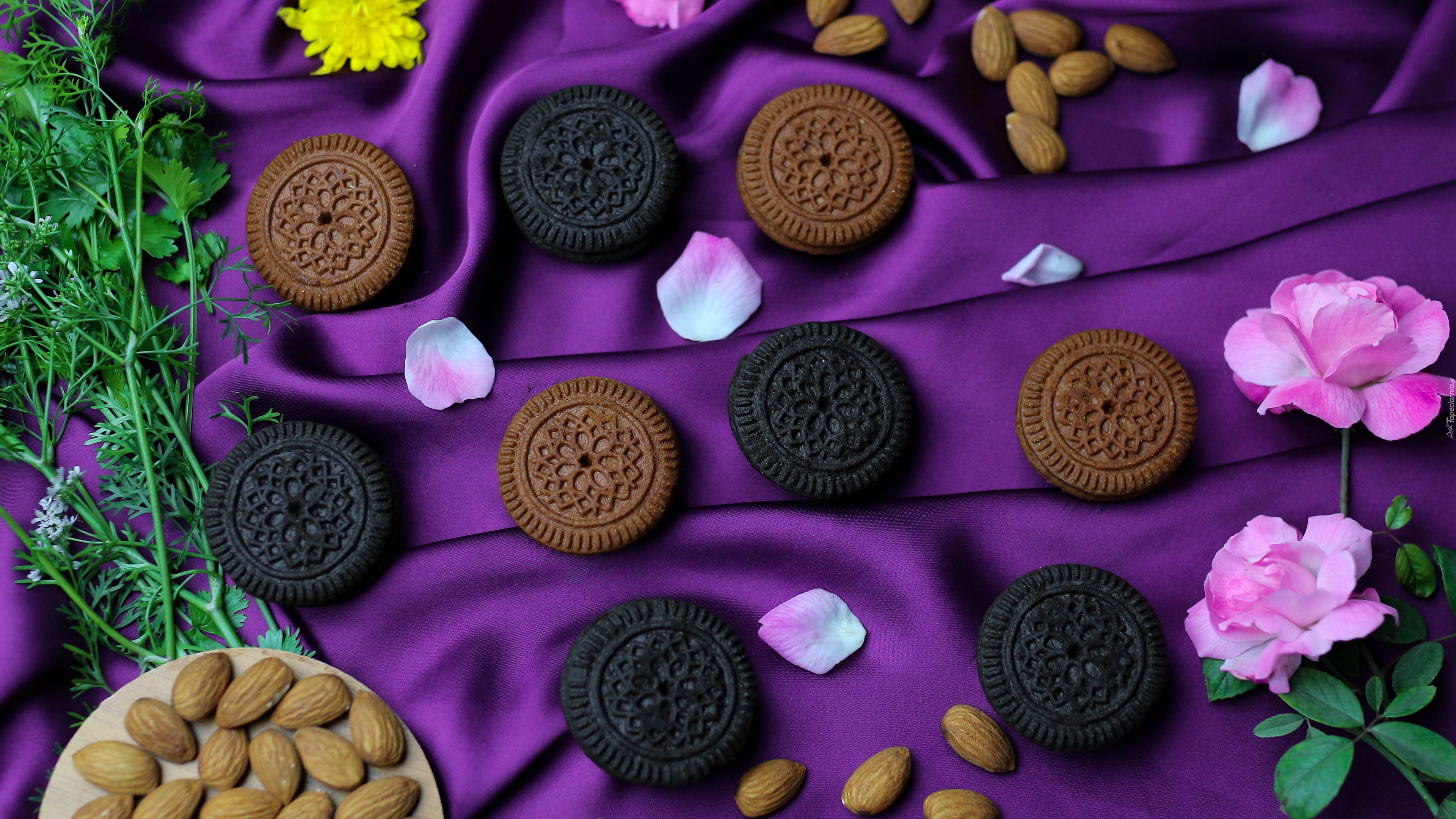 Edytor tapety: Ciastka i róże na fioletowym materiale