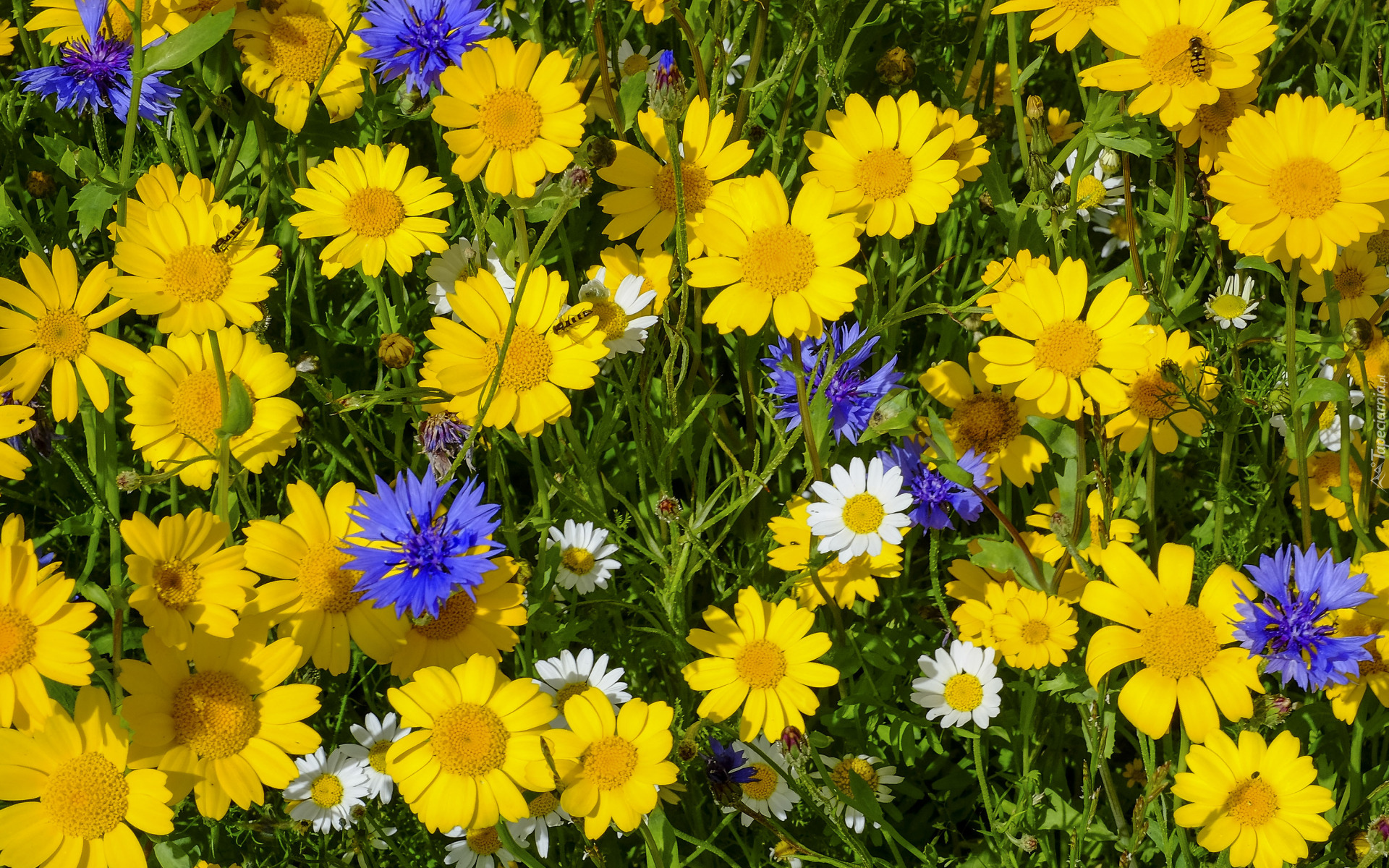 Edytor tapety: Rozświetlone kolorowe kwiaty na łące
