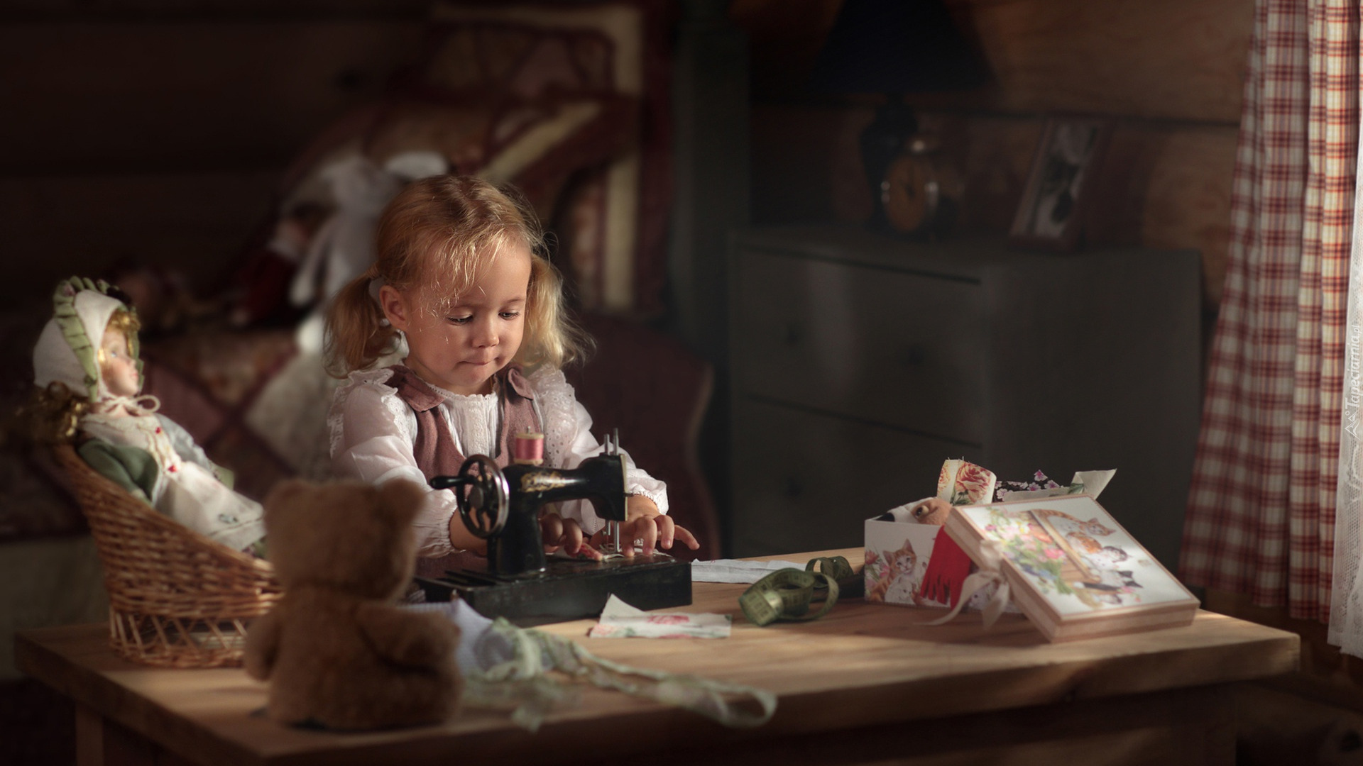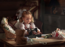 Edytor tapety: Dziewczynka szyjąca ubranka dla lalki