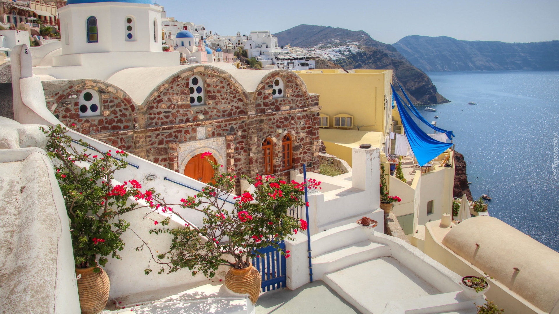 Edytor tapety: Kwiaty na patio domu w Santorini