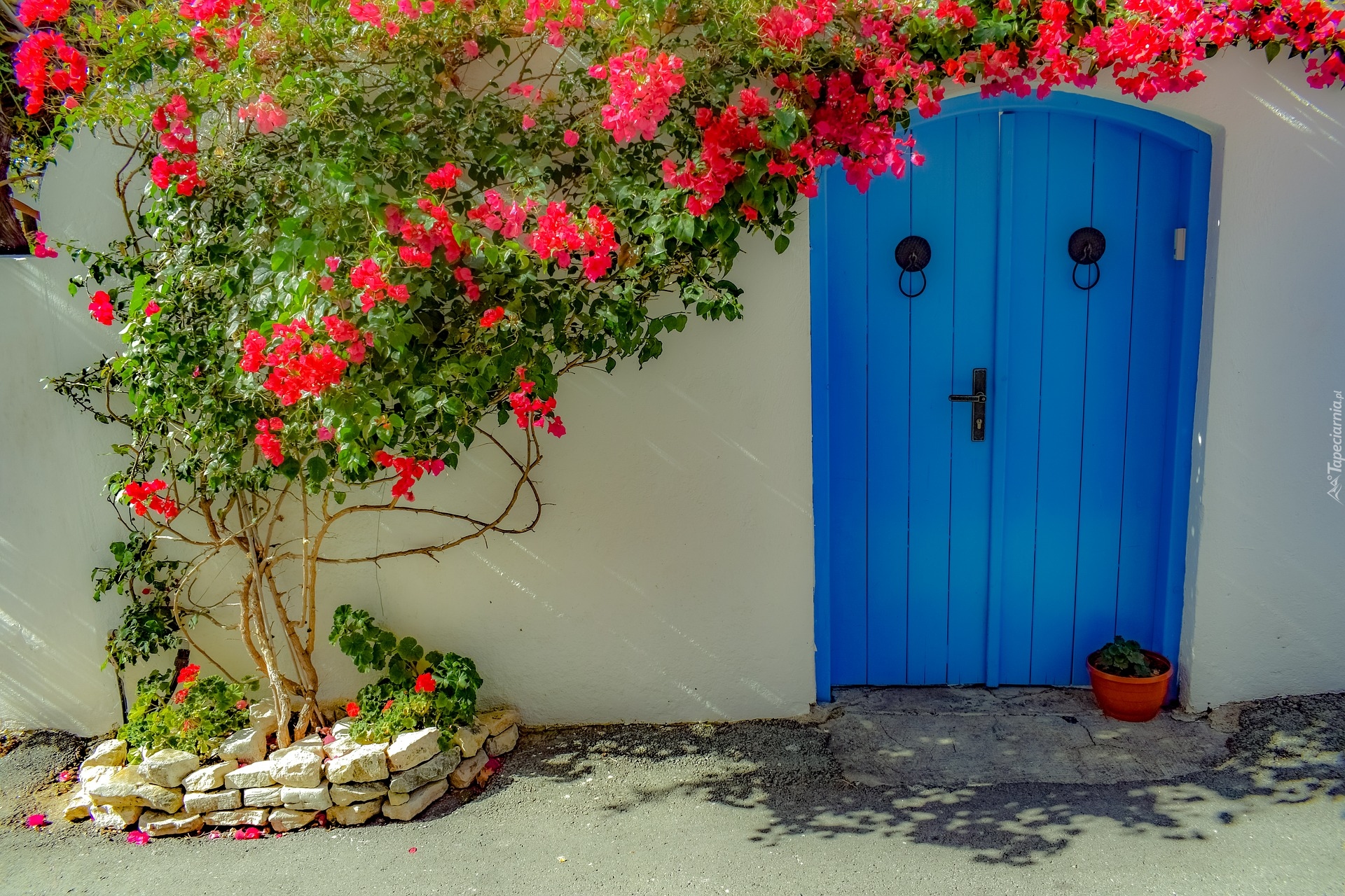 Edytor tapety: Kwitnąca bugenwilla obok niebieskich drzwi
