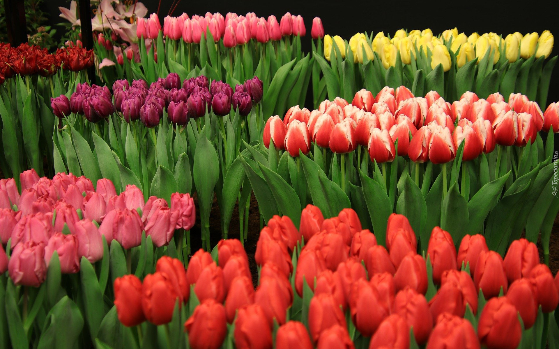 Edytor tapety: Rozkwitające tulipany w różnych kolorach