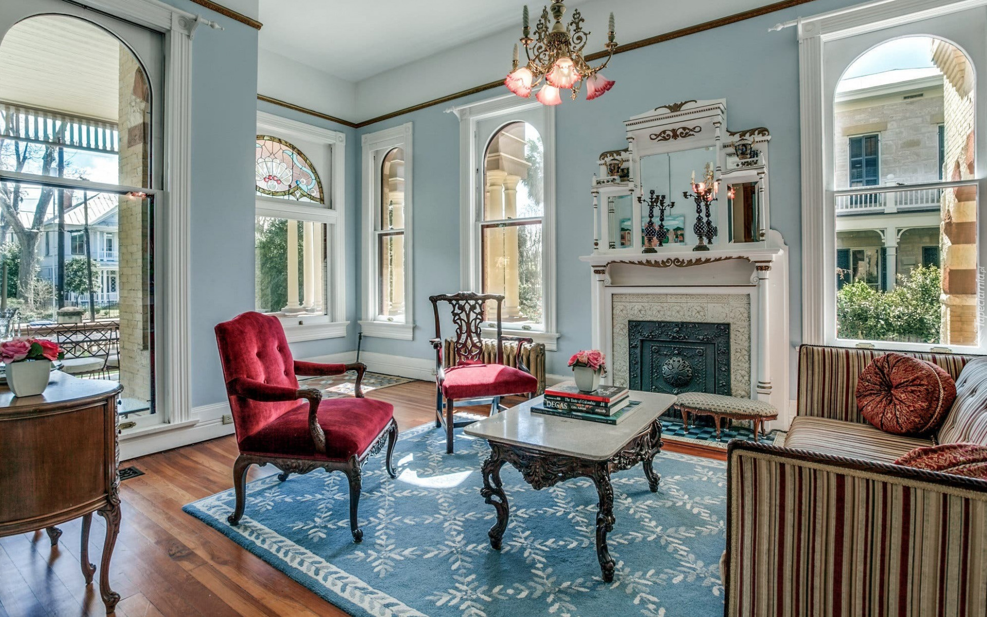 Edytor tapety: Krzesła i ława przy kominku w salonie