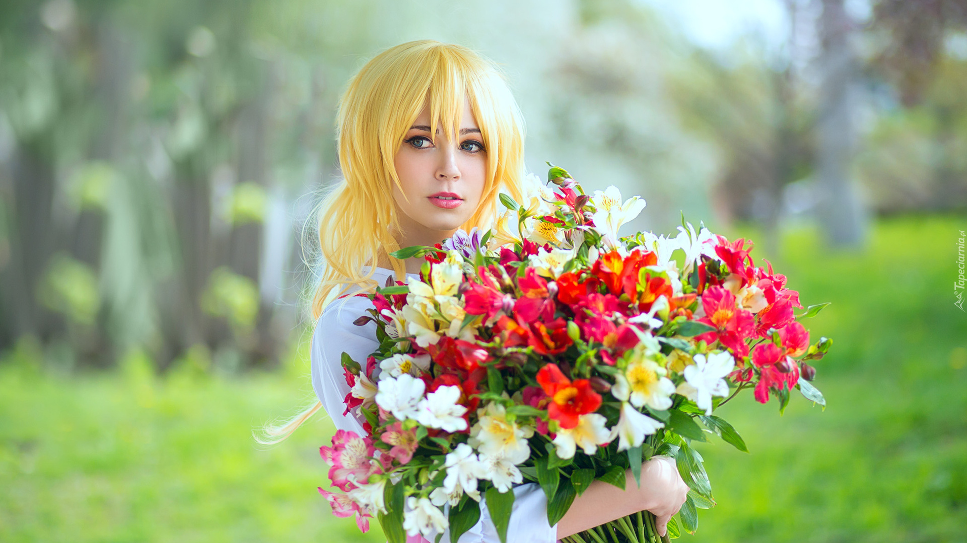 Edytor tapety: Blondynka trzymająca bukiet kwiatów