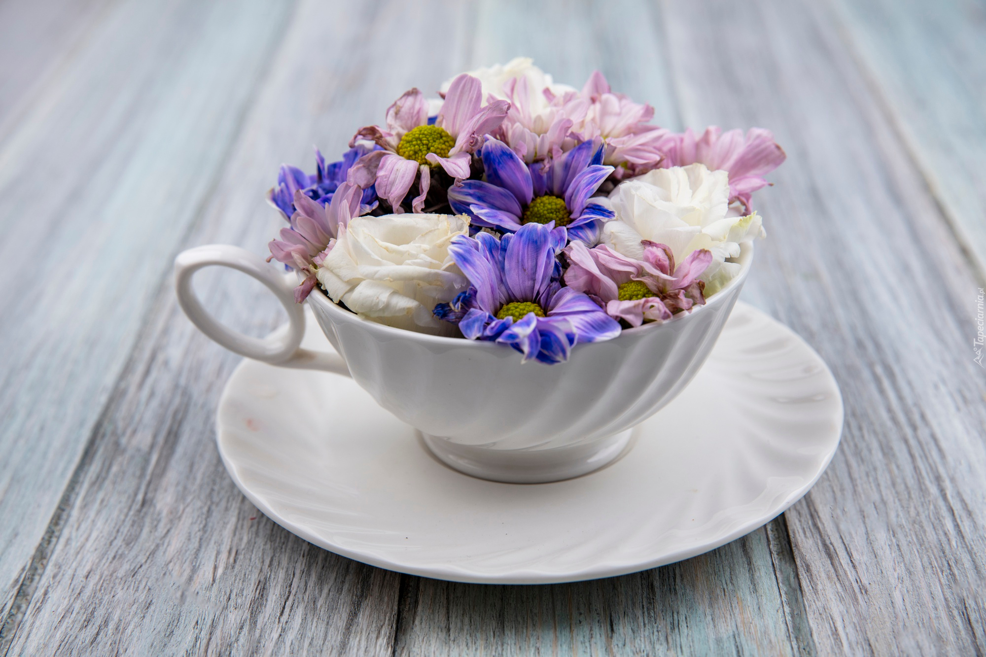 Edytor tapety: Kolorowe kwiaty w filiżance
