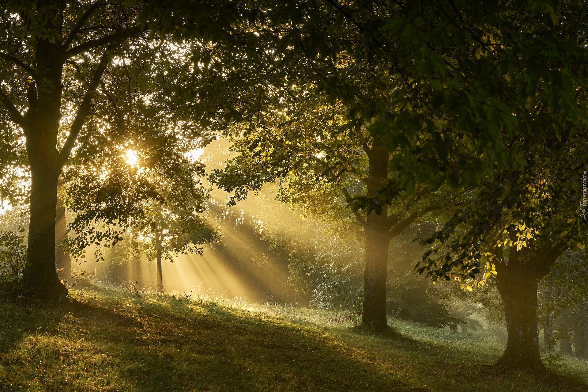 Edytor tapety: Promienie słońca w zamglonym lesie liściastym