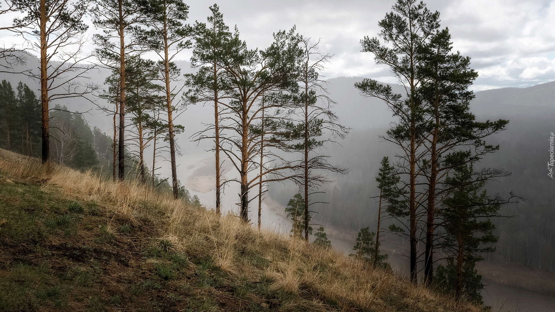 Edytor tapety: Drzewa na skarpie i zamglona rzeka w oddali